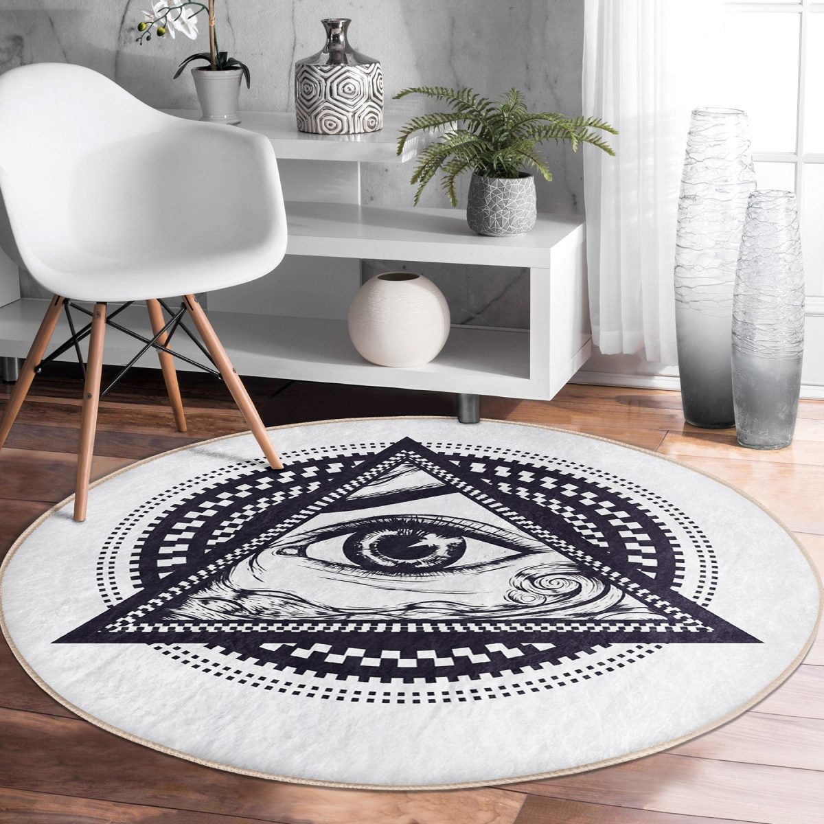 Beyaz Zeminde Lacivert Üçüncü Göz Dijital Baskılı Salon ve Oturma Odası Yıkanabilir Kaymaz Tabanlı Yuvarlak Halı