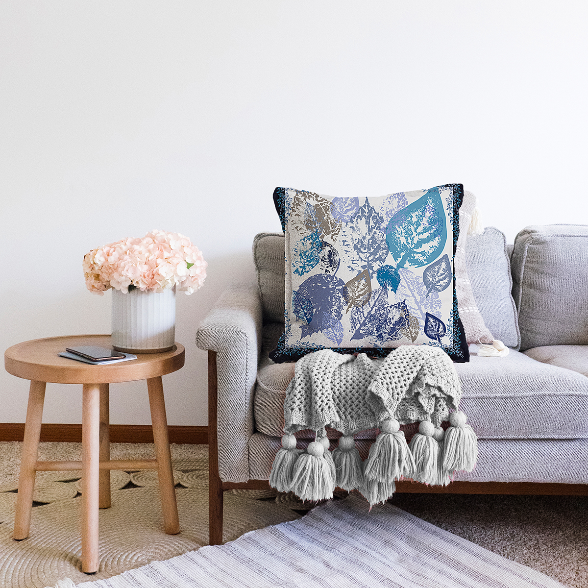 Beyaz Zeminde Mavi Yaprak Motifli Dijital Baskılı Modern Şönil Yastık Kırlent Kılıfı