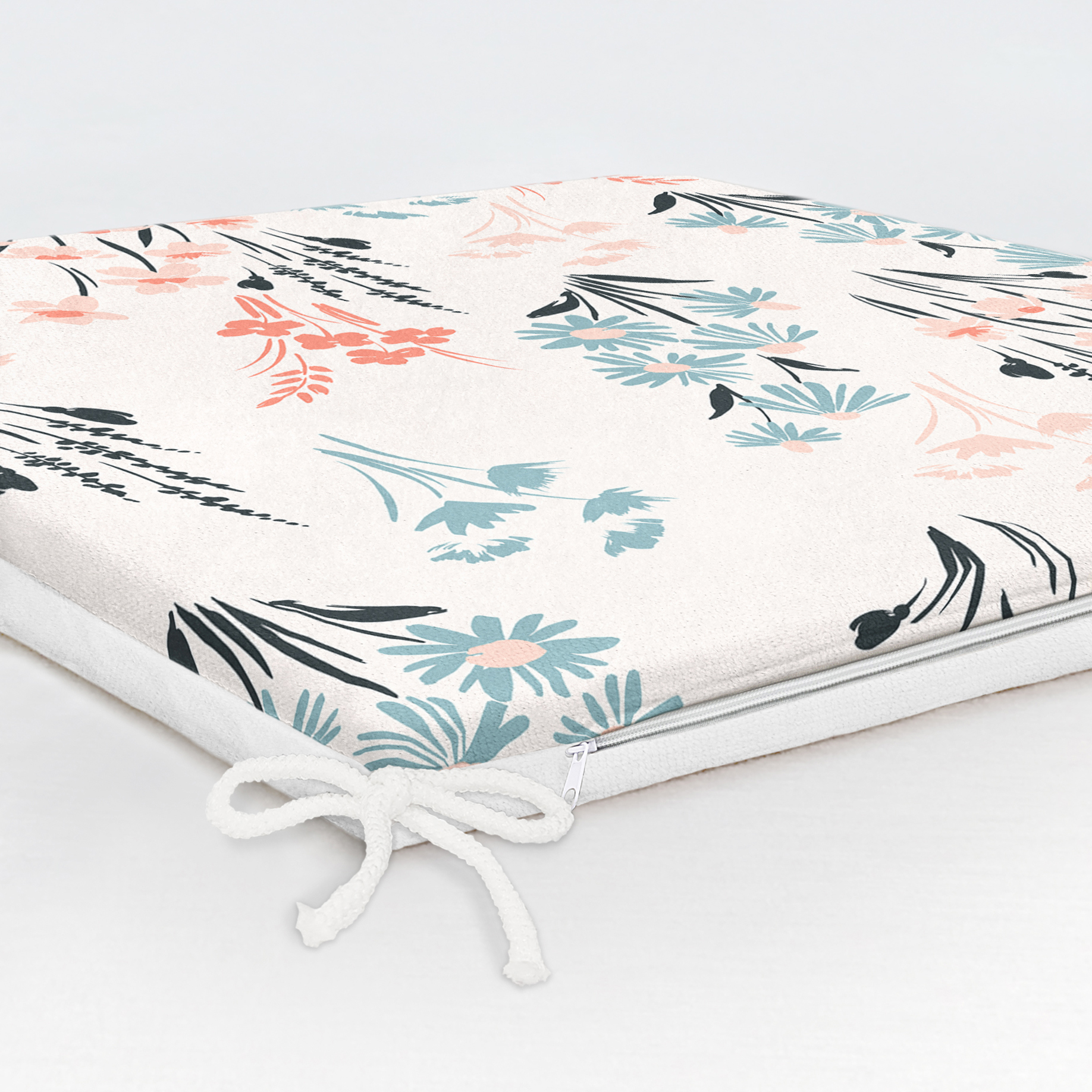 Beyaz Zeminde Renkli Çiçek Desenli Dijital Baskılı Modern Fermuarlı Sandalye Minderi