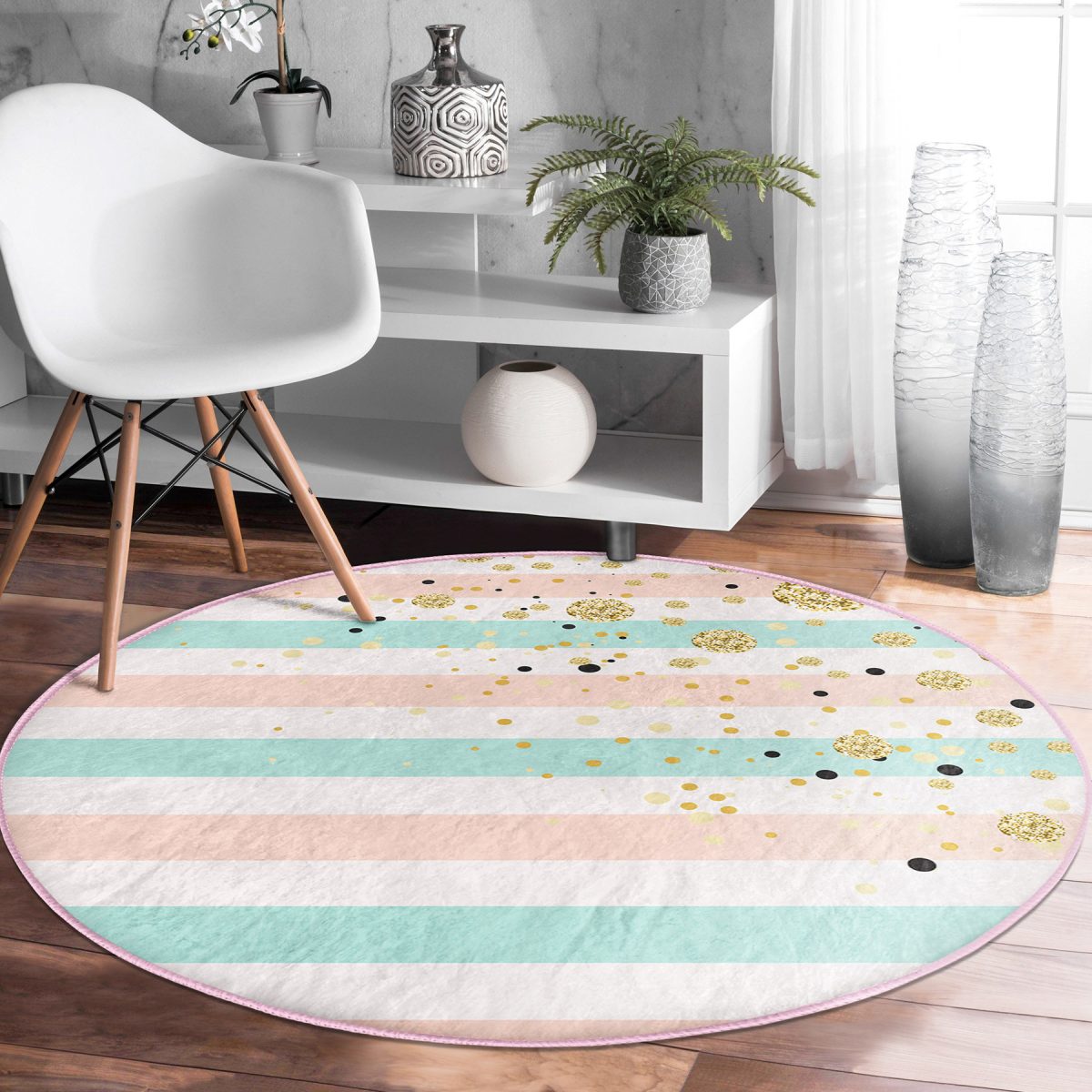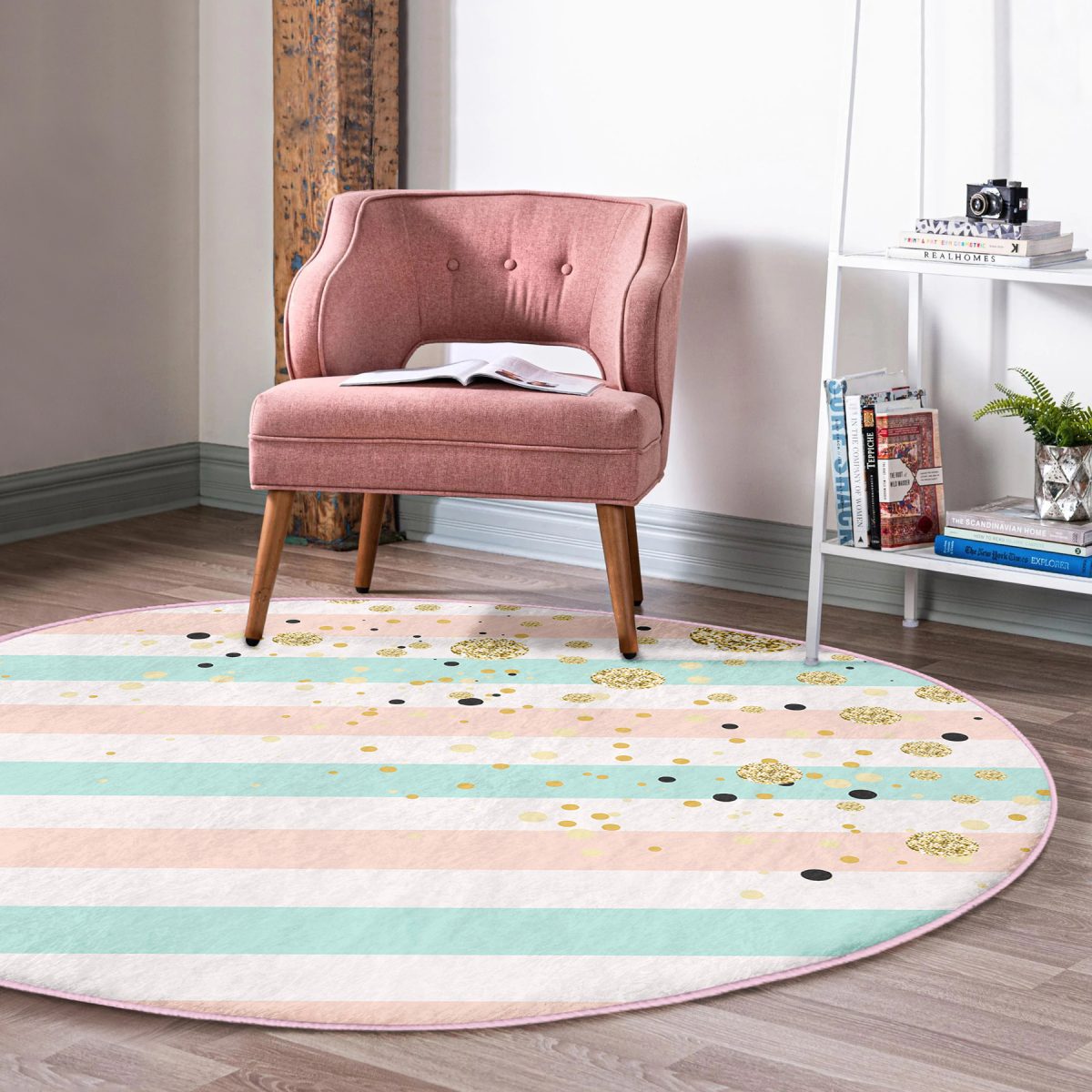 Beyaz Zeminde Renkli Yatay Çizgili Gold Detaylı Dijital Baskılı Modern Pembe Yatak Odası Yıkanabilir Kaymaz Tabanlı Yuvarlak Halı