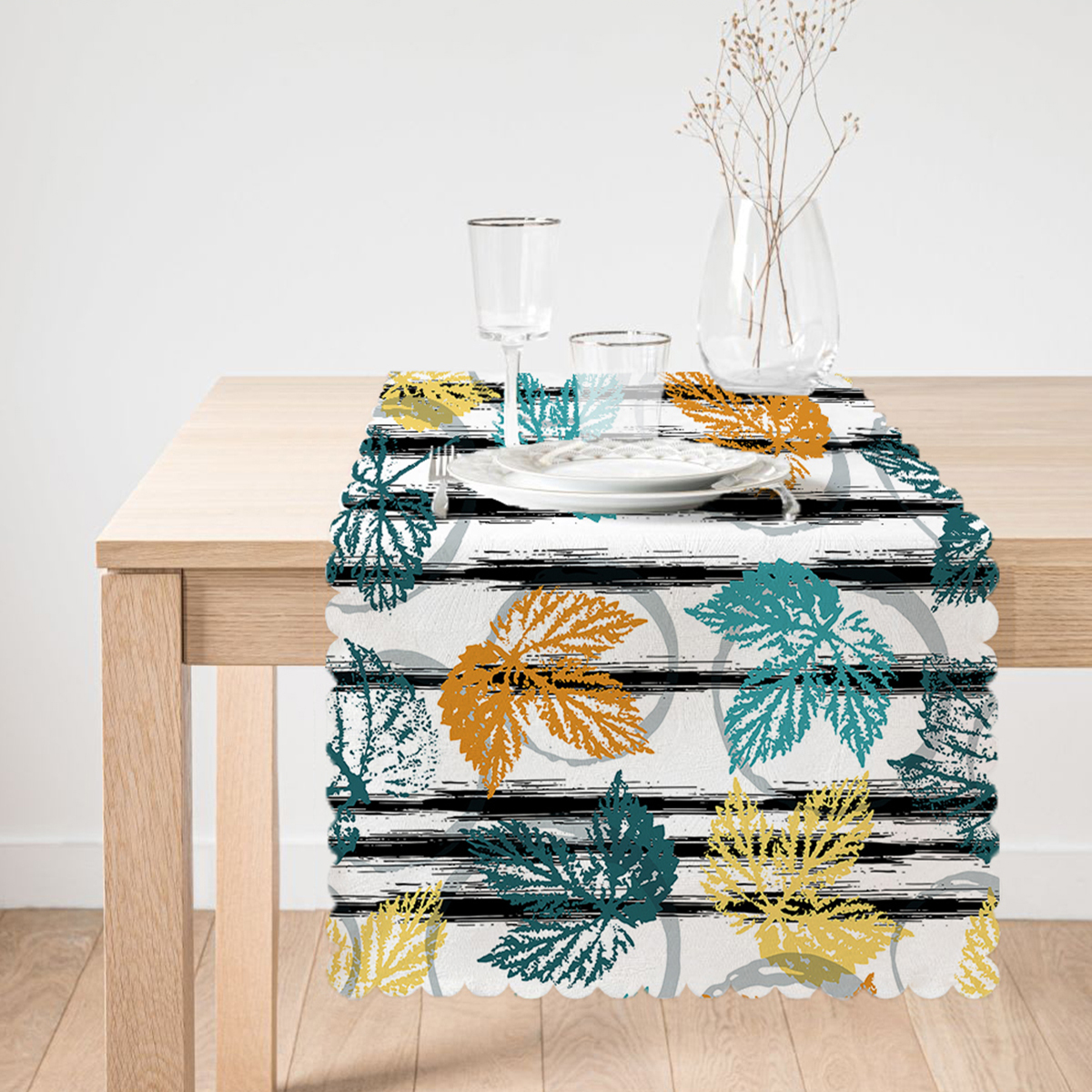 Beyaz Zeminde Siyah Çizgili Renkli Yaprak Desenli Dijital Baskılı Modern Runner Realhomes