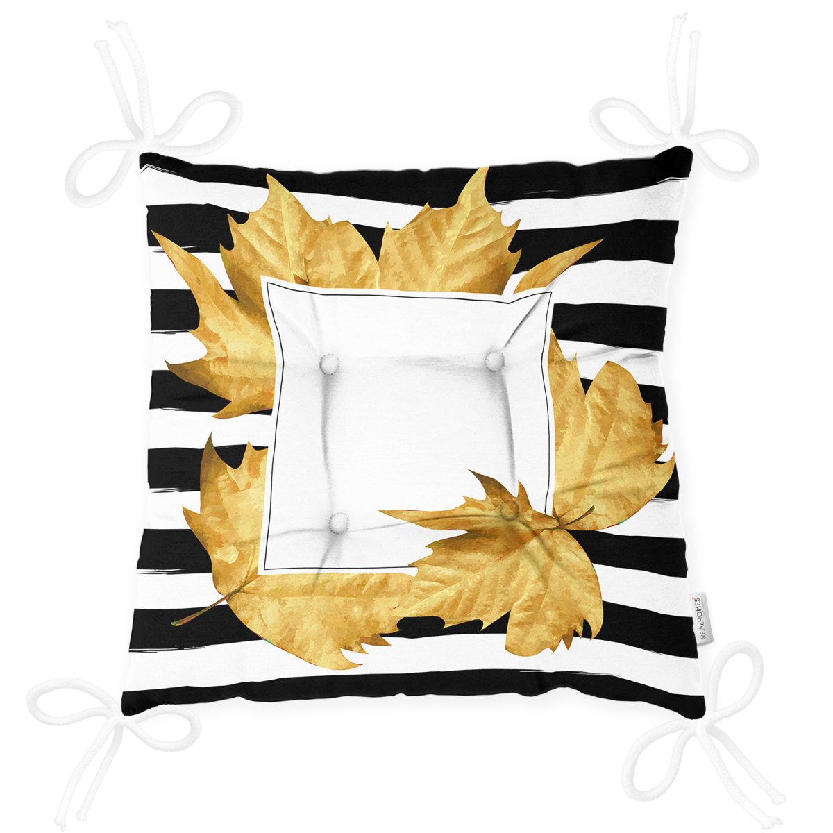 Beyaz Zeminde Siyah Çizgili Sonbahar Yaprak Desenli Dijital Baskılı Modern Pofuduk Sandalye Minderi