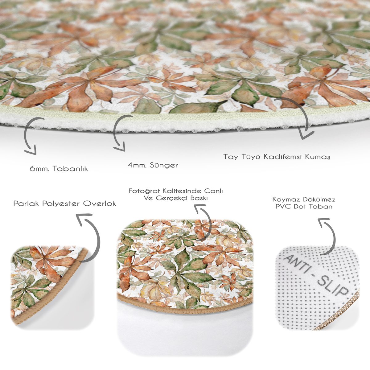 Beyaz Zeminde Sonbahar Yaprak Desenli Dijital Baskılı Modern Renkli Koridor ve Antre Yıkanabilir Kaymaz Tabanlı Yuvarlak Halı