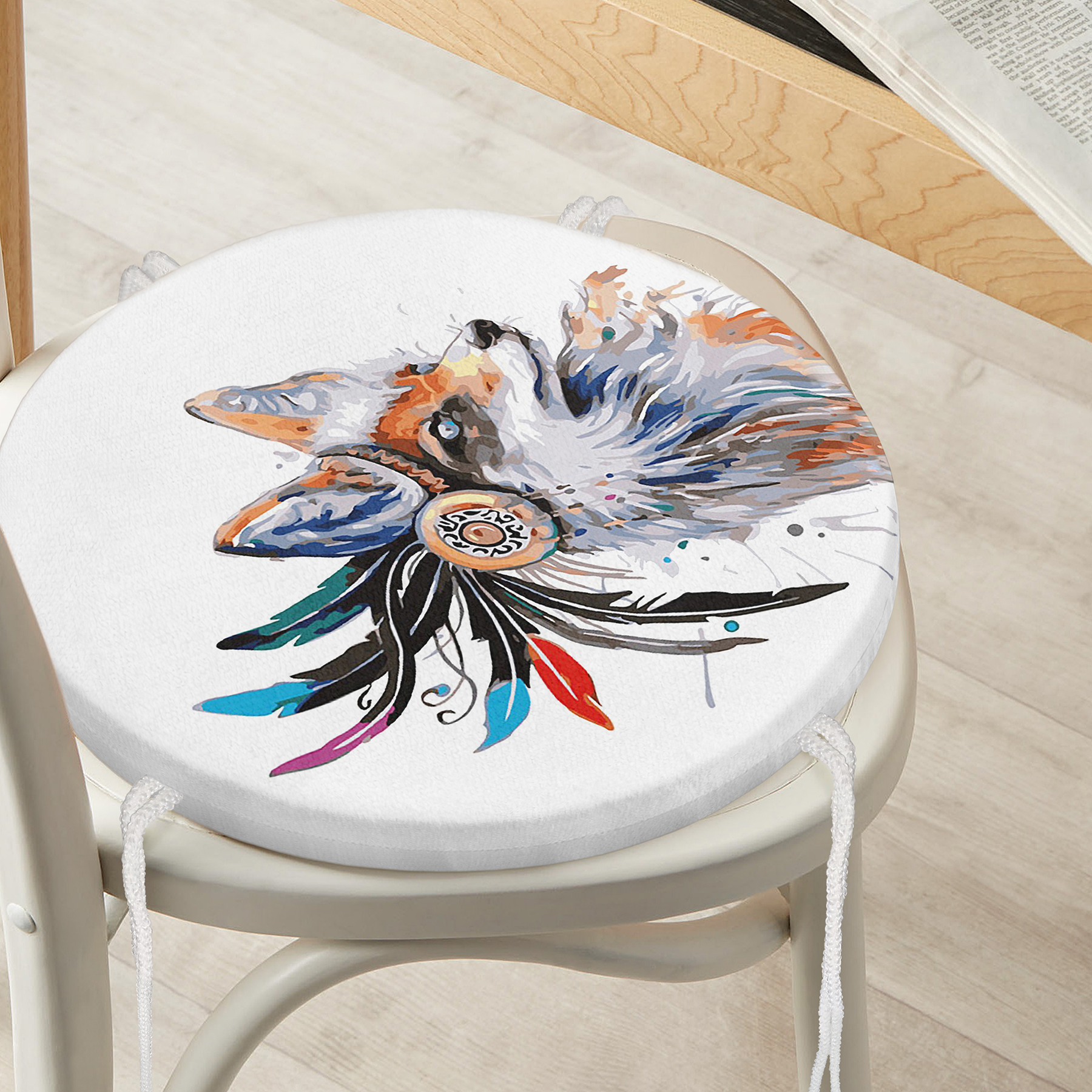 Beyaz Zeminde Suluboya Kurt Desenli Yuvarlak Fermuarlı Sandalye Minderi Realhomes
