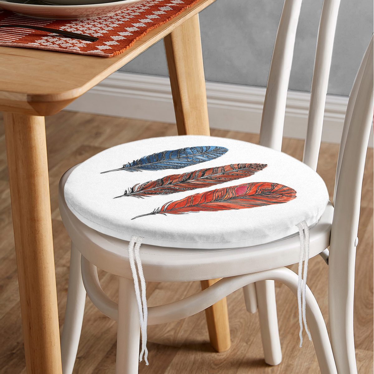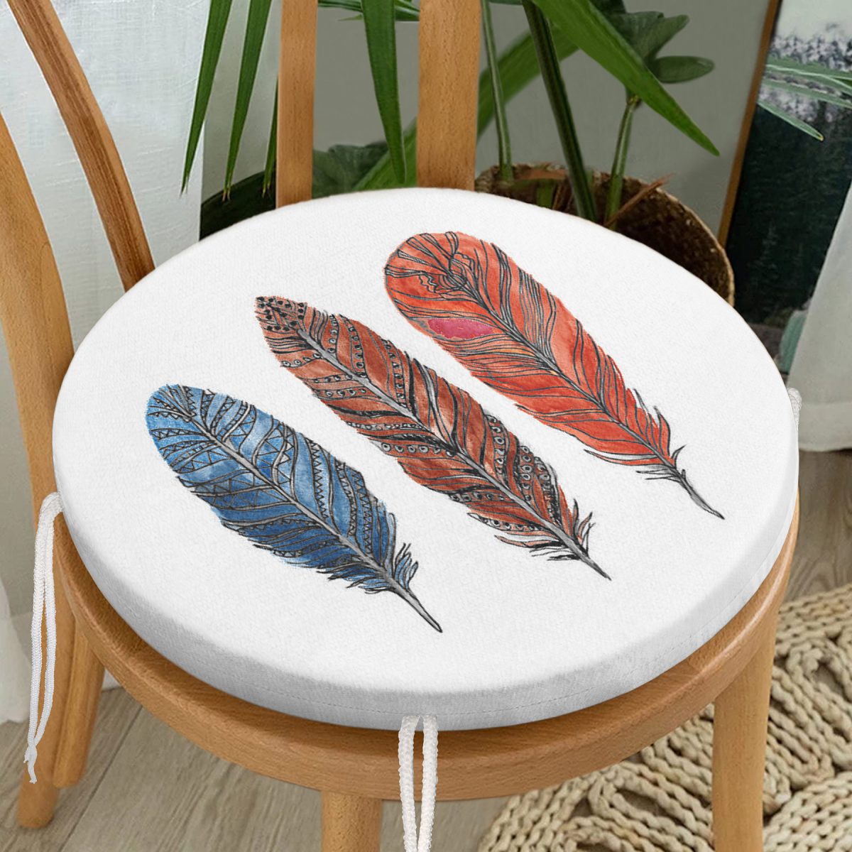 Beyaz Zeminde Üç Renkli Tüy Desenli Yuvarlak Fermuarlı Sandalye Minderi