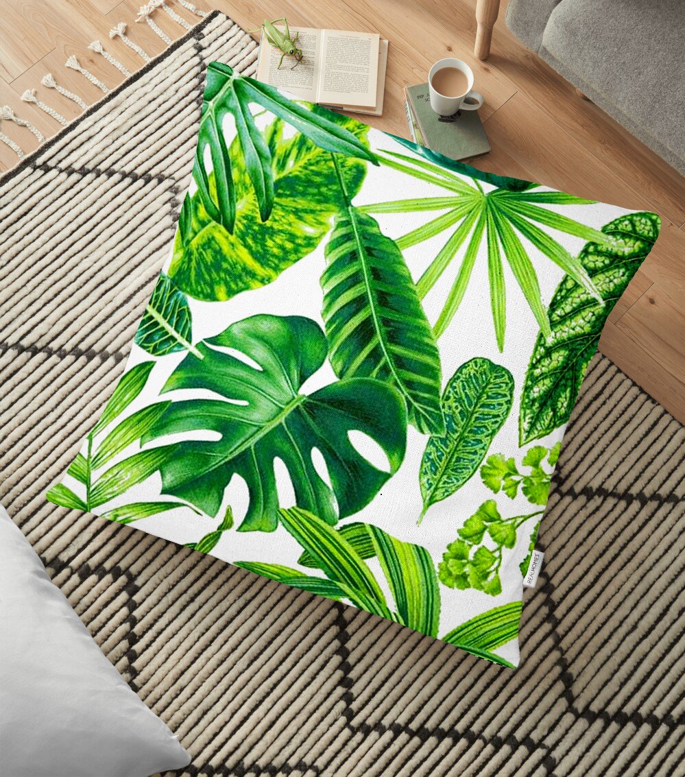 Beyaz Zeminde Watercolor Yapraklar Özel Tasarımlı Yer Minderi – 70 x 70 cm