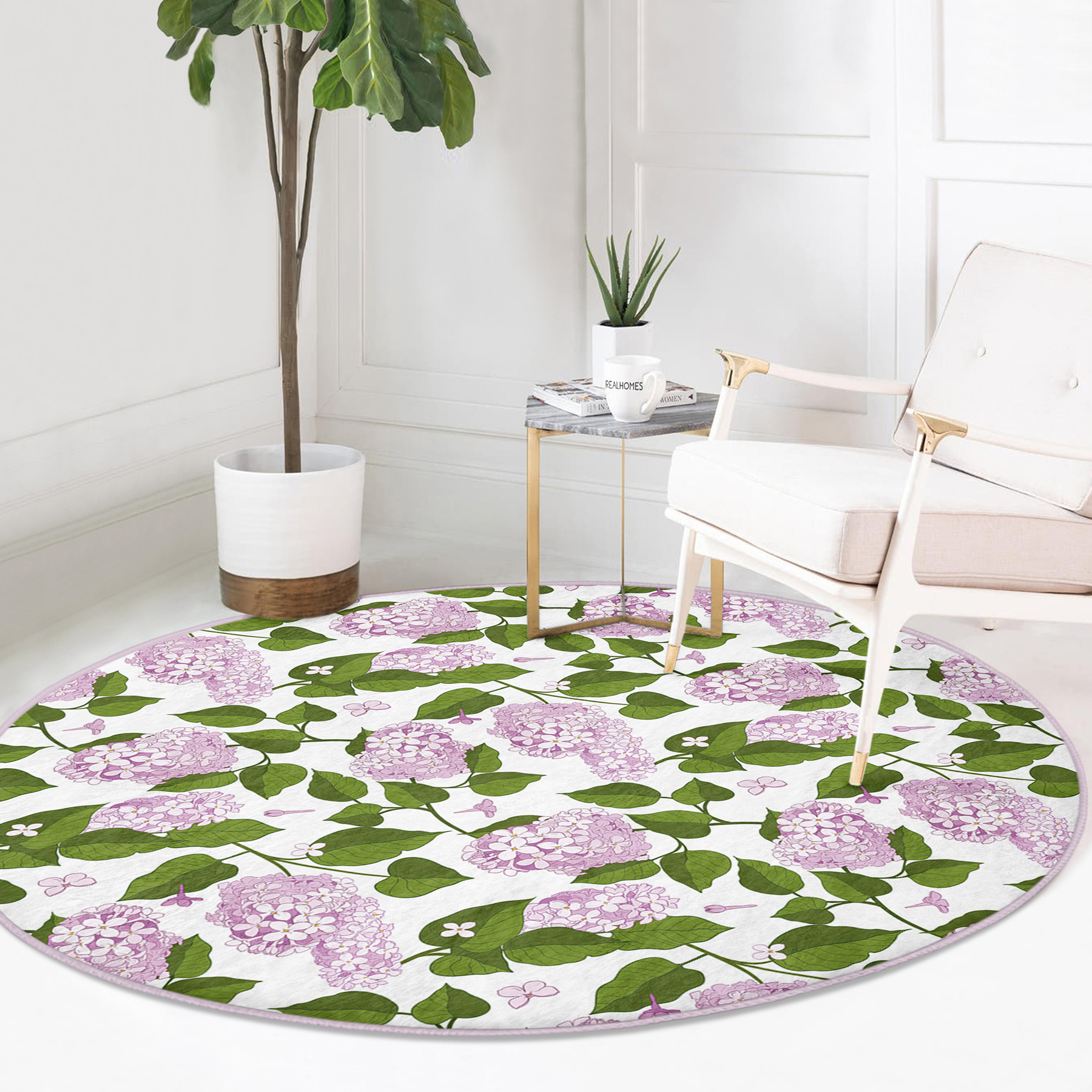 Beyaz Zeminde Yeşil Yapraklı Çiçek Desenli Dijital Baskılı Modern Pembe Salon ve Oturma Odası Kaymaz Tabanlı Yuvarlak Halı