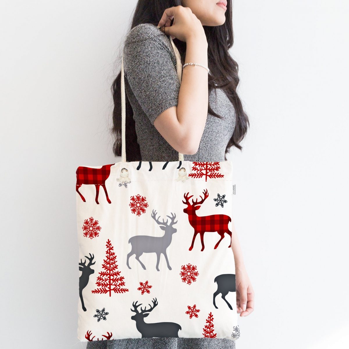 Beyaz Zeminde Yılbaşı Motifleri Dijital Baskılı Fermuarlı Kumaş Çanta