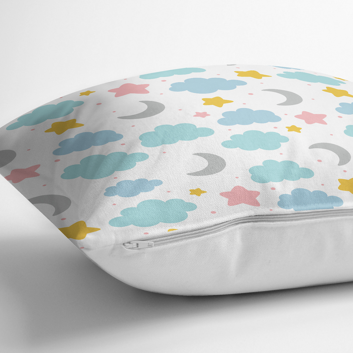 Beyaz Zeminli Bulut Ve Ay Desenli Dijital Baskılı Özel Tasarım Modern Yastık Kırlent Kılıfı Realhomes