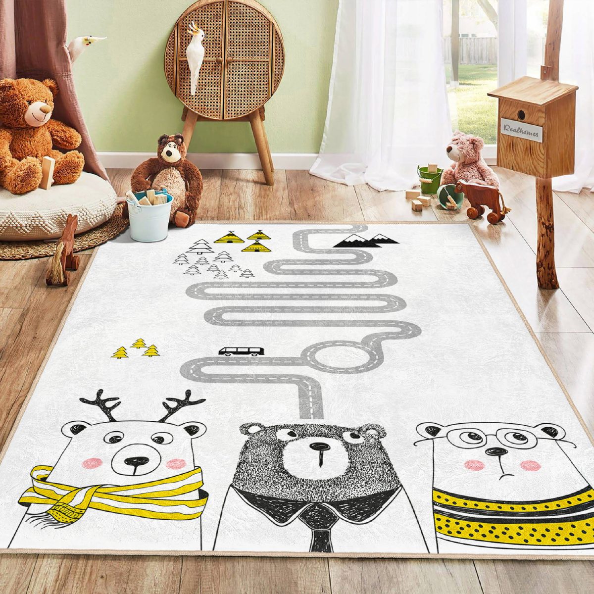 Beyaz Zeminli Sevimli Ayılar Eğitici Yol Tasarımlı Çocuk & Genç Odası Makinede Yıkanabilir Kaymaz Tabanlı Dikdörtgen Leke Tutmaz Çocuk Oyun Halısı