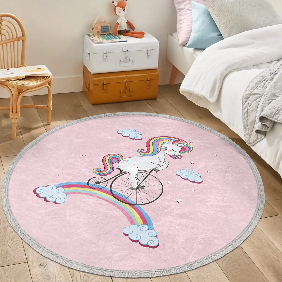 Bisiklete Binmiş Unicorn Desenli Çocuk & Genç Odası Makinede Yıkanabilir Kaymaz Tabanlı Püsküllü Yuvarlak Çocuk Halısı
