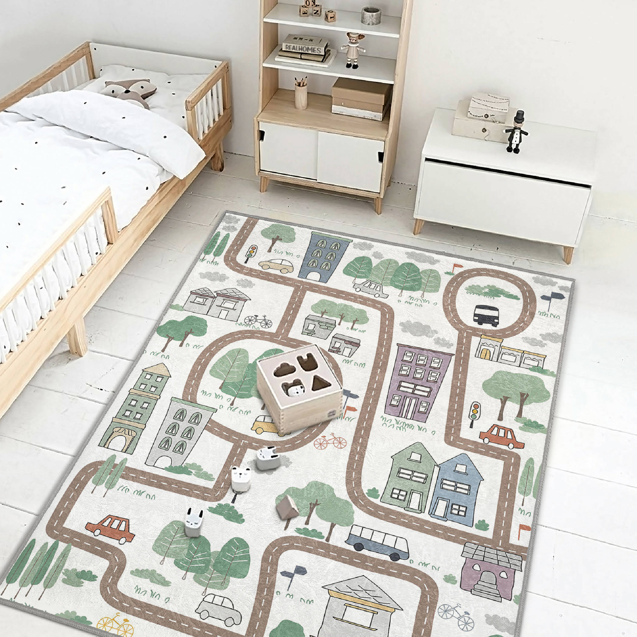 Bizim Mahalle Yolları Eğitici Yol Çizimli Çocuk & Genç Odası Makinede Yıkanabilir Kaymaz Tabanlı Dekoratif Dikdörtgen Çocuk Oyun Halısı