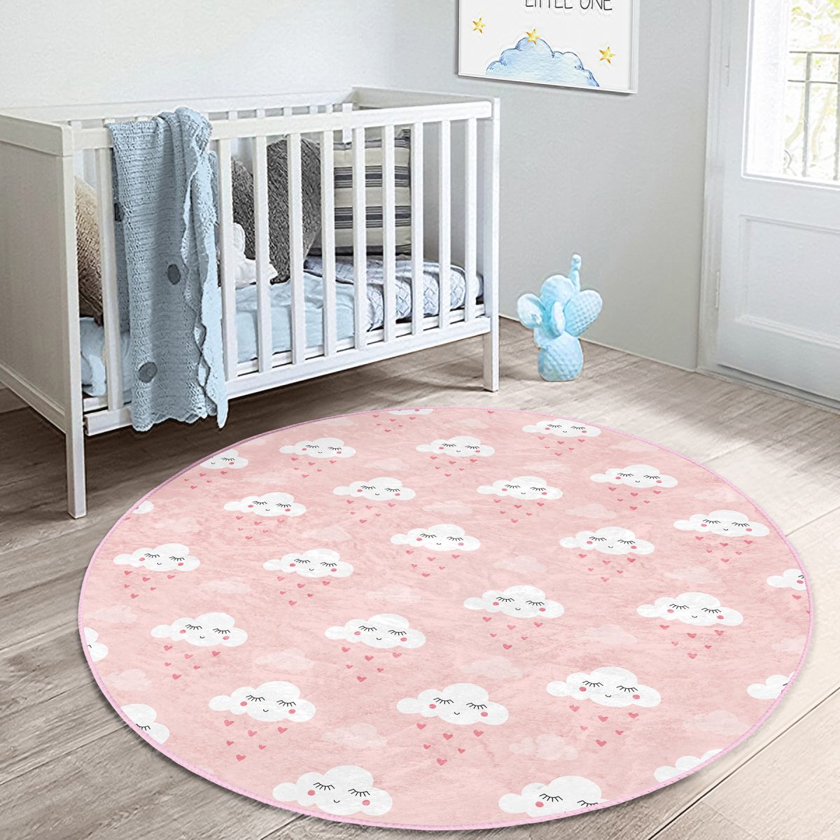 Bulut Desenli Çocuk & Genç Odası Makinede Yıkanabilir Kaymaz Tabanlı Yuvarlak Çocuk Halısı