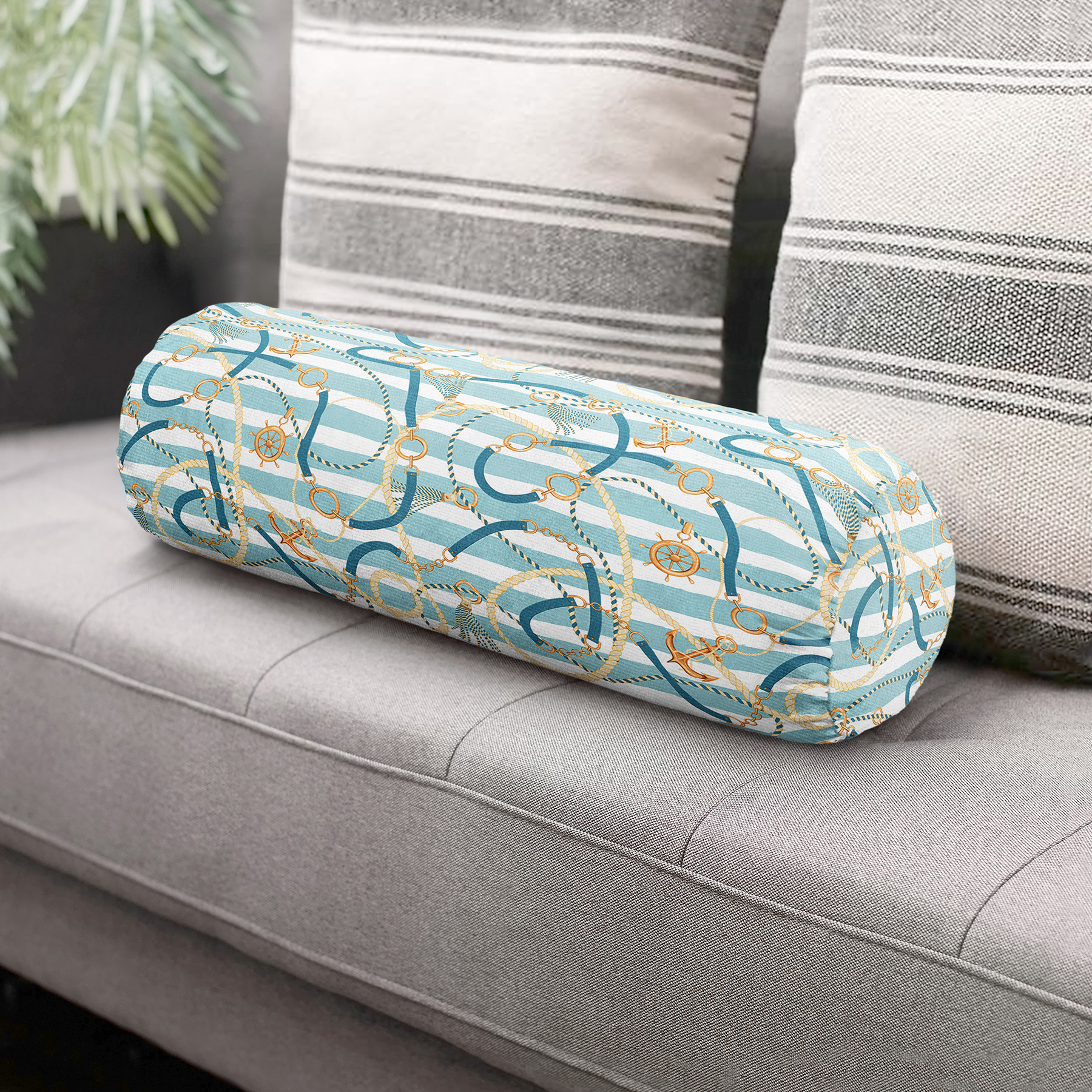 Çapa Ve Kemer Motifli Özel Tasarım Dijital Baskılı Modern İç Dolgulu – Fermuarlı Süet Berjer Silindir Yastık Kırlent