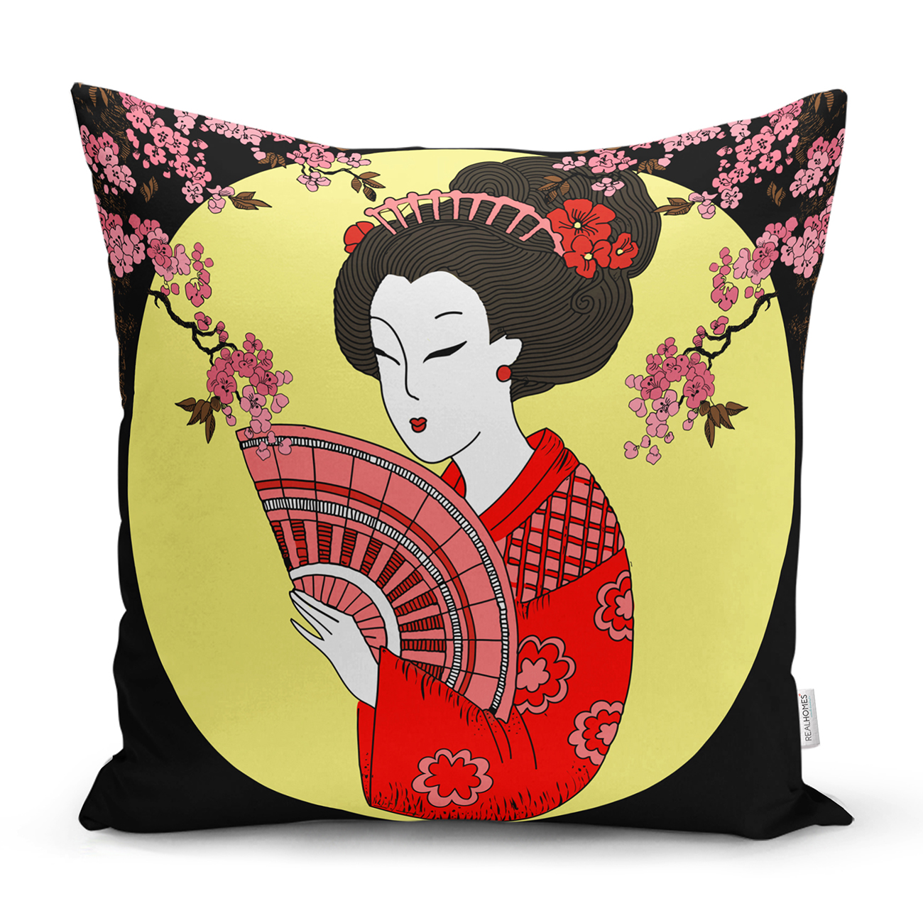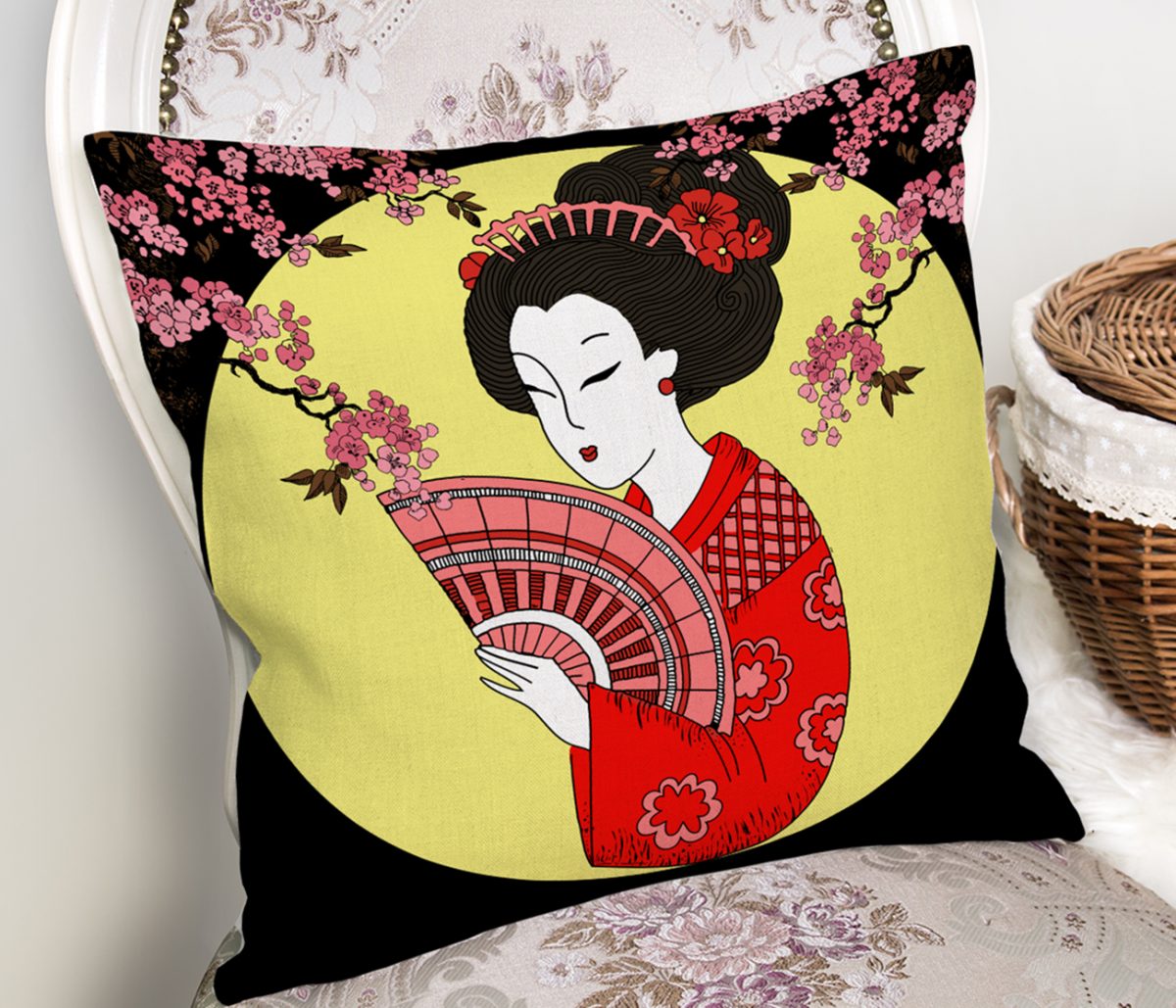 Çiçek Desenli Yelpazeli Japon Kız Motifli Modern Yastık Kılıfı Realhomes