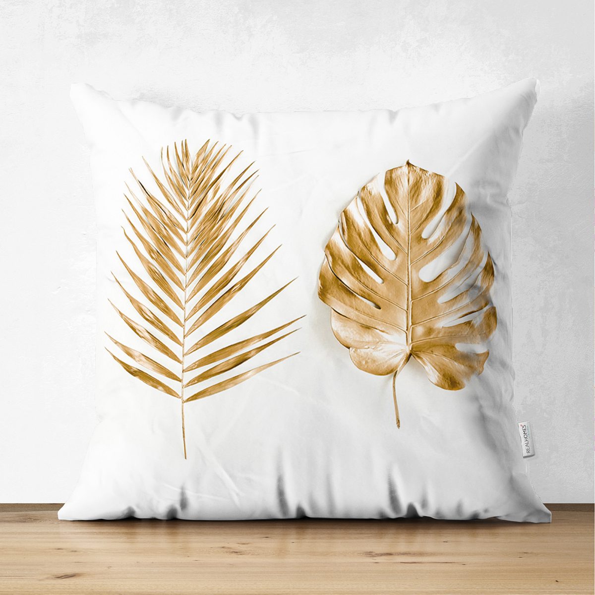 Çift Taraflı 3D Altın Görünümlü Palmiye Yaprakları Modern Süet Yastık Kırlent Kılıfı Realhomes
