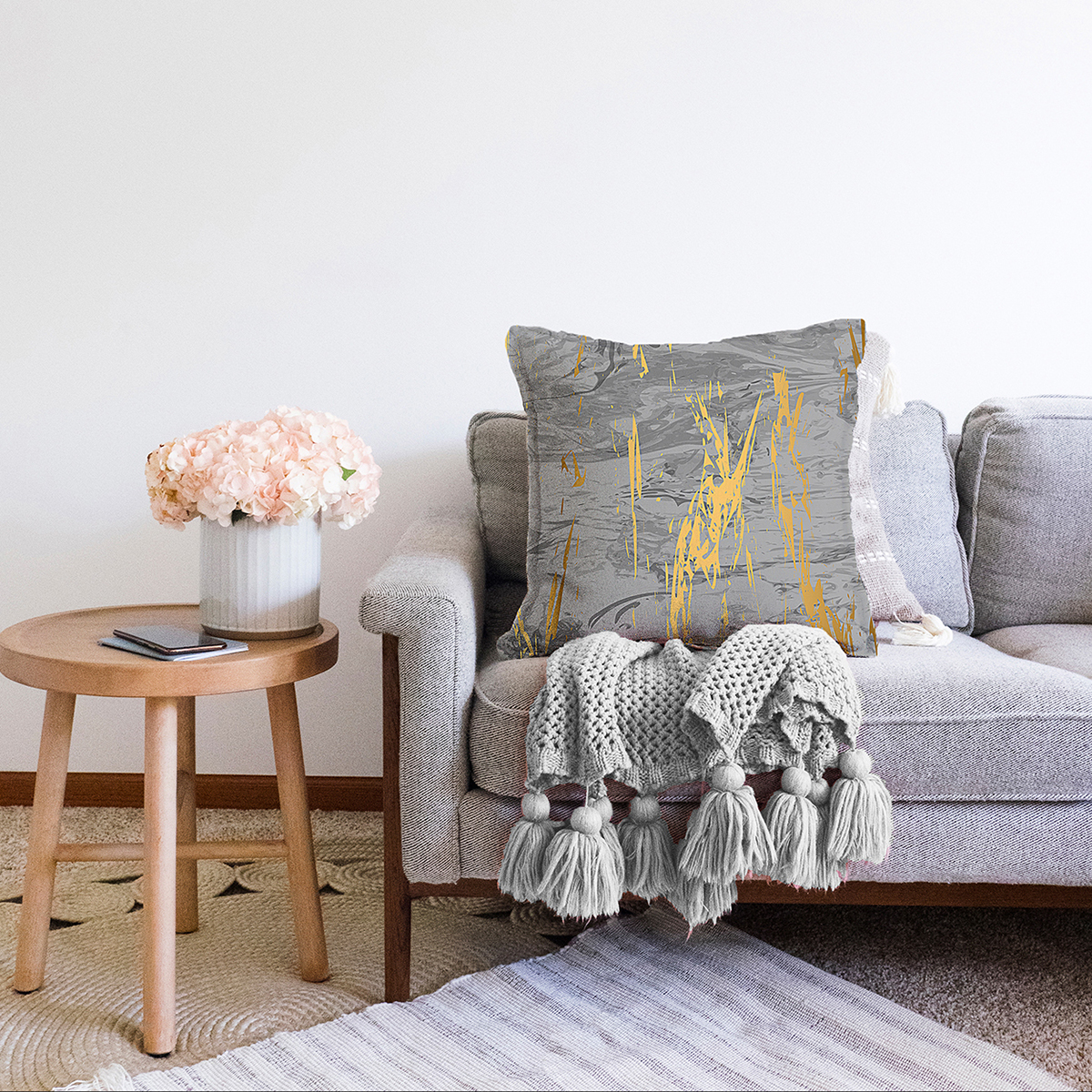 Antrasit Zemin Üzerinde Gold Detaylı Çizim Desenli Modern Raşel Kadife Yastık Kırlent Kılıfı