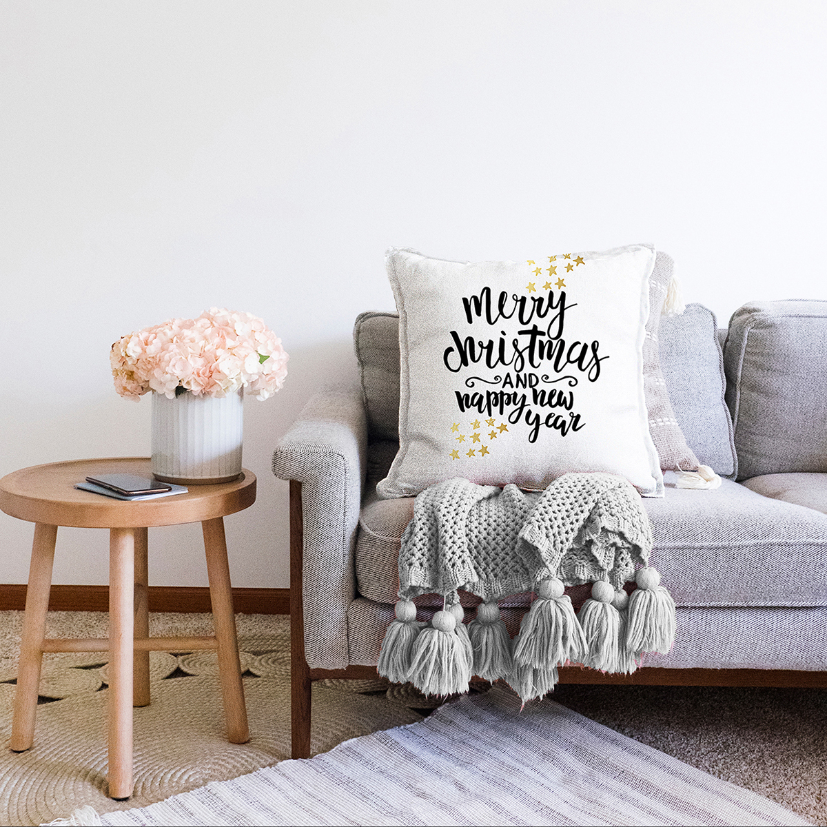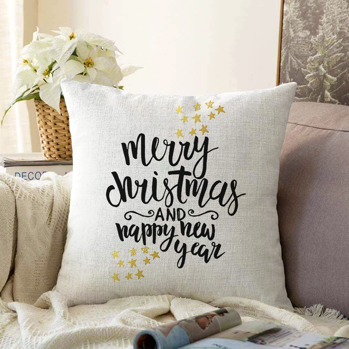 Beyaz Zemin Üzerinde Gold Detaylı Merry Christmas Yazılı Raşel Kadife Yastık Kırlent Kılıfı