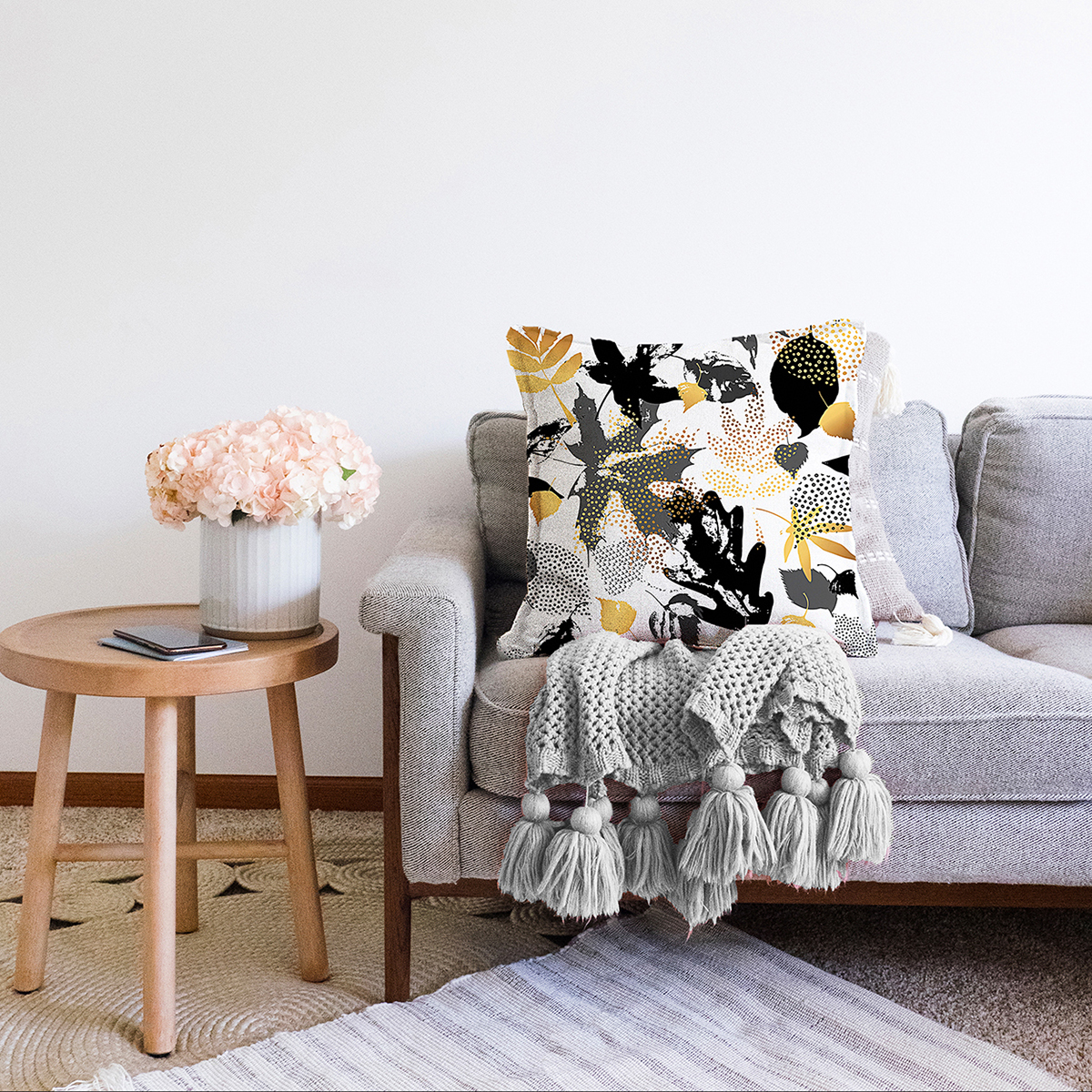Beyaz Zemin Üzerinde Gold Detaylı Yaprak Desenli Modern Raşel Kadife Yastık Kırlent Kılıfı