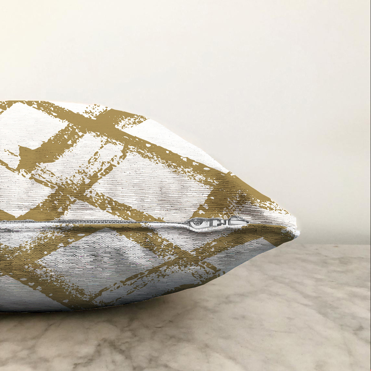 Beyaz Zemin Üzerinde Gold Renkli Geometrik Çizimli Modern Raşel Kadife Yastık Kırlent Kılıfı