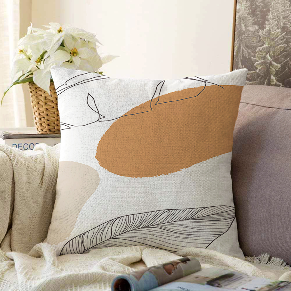 Beyaz Zemin Üzerinde Onedraw Çizimli Yaprak Motifli Raşel Kadife Yastık Kırlent Kılıfı