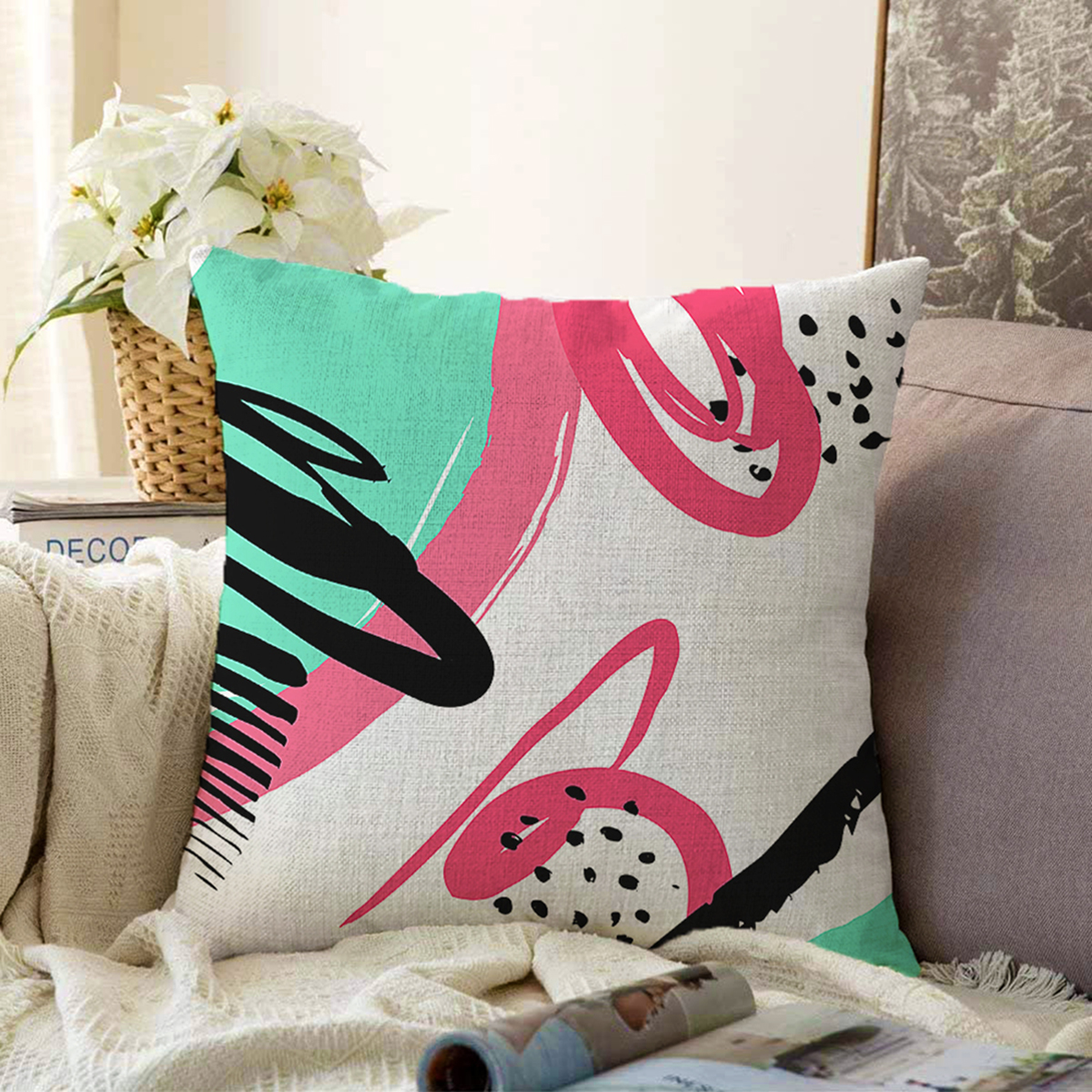 Beyaz Zemin Üzerinde Soyut Çizimli Renkli Desen Çalışması Raşel Kadife Yastık Kırlent Kılıfı