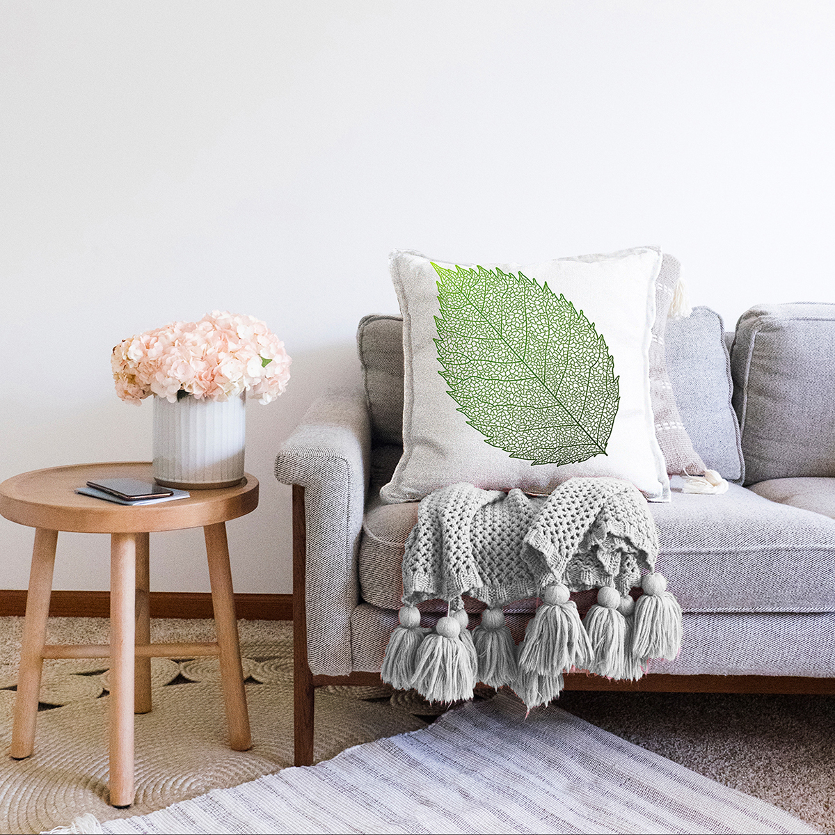 Beyaz Zemin Üzerinde Yeşil Sonbahar Yaprak Desenli Modern Raşel Kadife Yastık Kırlent Kılıfı