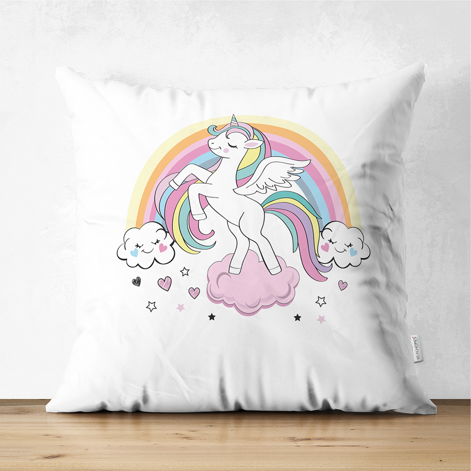 Çift Taraflı Beyaz Zeminde Unicorn At ve Yıldızlar Çocuk Odası Süet Yastık Kırlent Kılıfı Realhomes