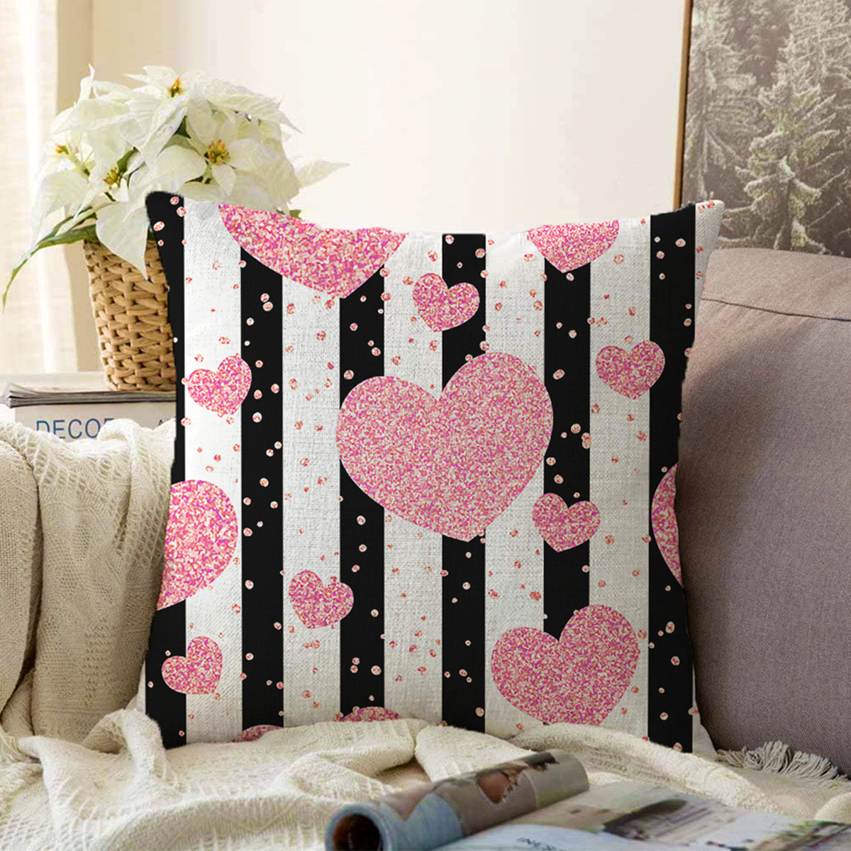 Beyaz Zeminli Renkli Kalp Desenli Dijital Baskılı Modern Raşel Kadife Yastık Kırlent Kılıfı