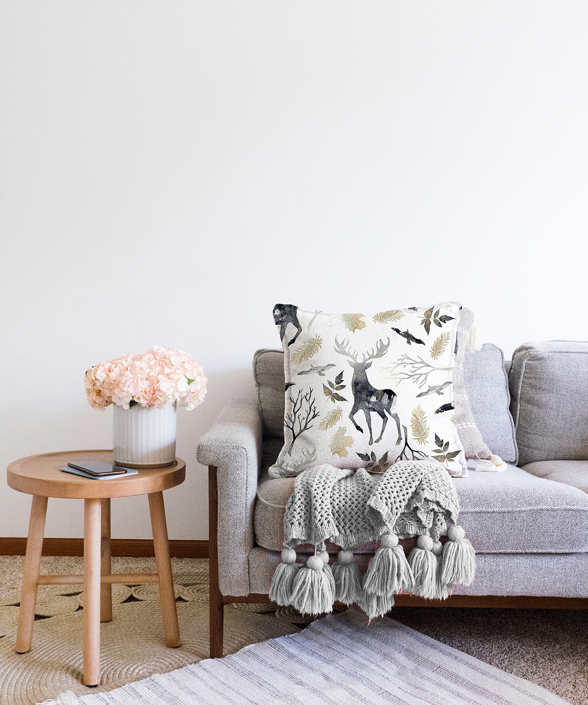 Ekru Zeminli Geyik ve Yaprak Motifler Dijital Baskılı Raşel Kadife Yastık Kırlent Kılıfı