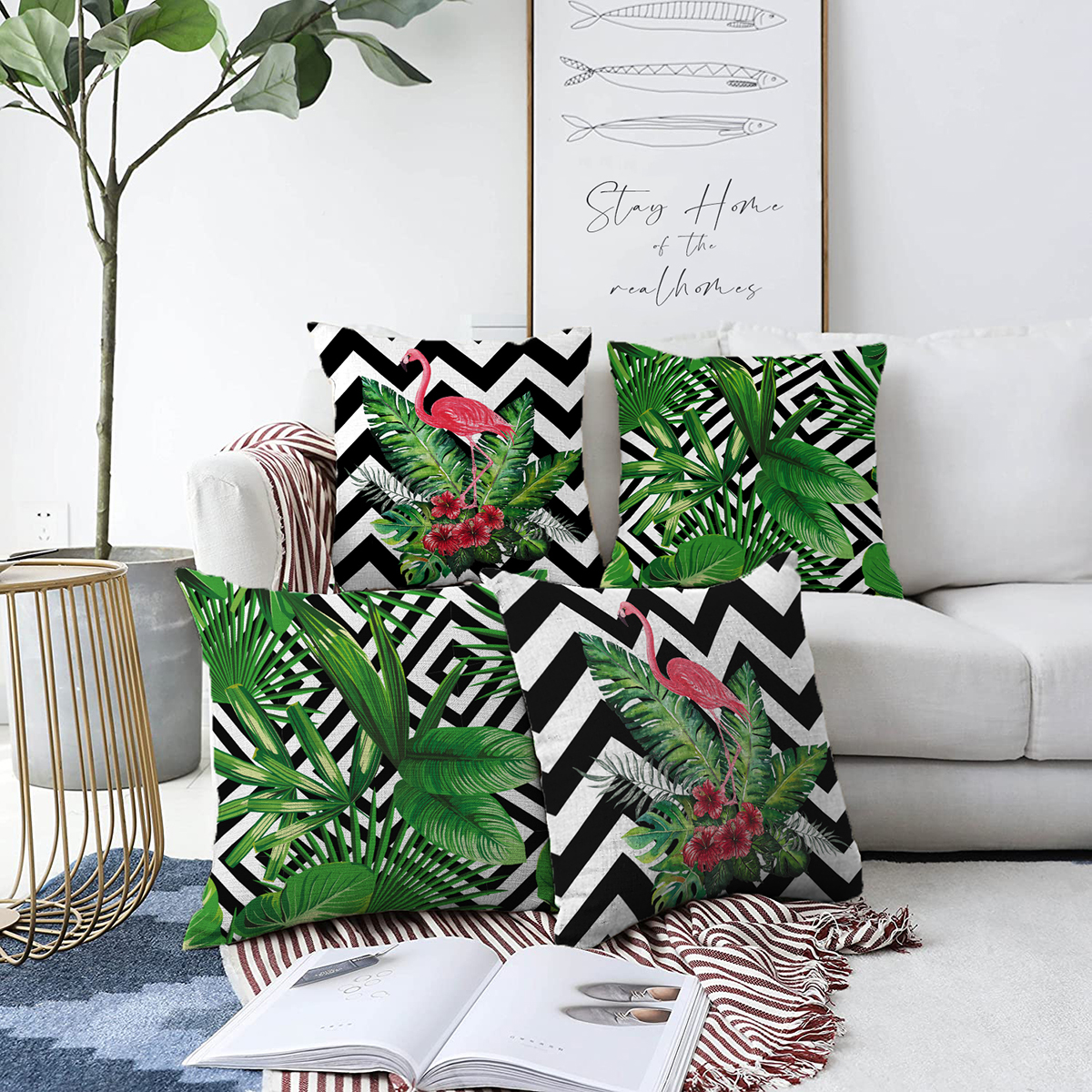 Çift Taraflı Geometrik Çizgiler Üzerinde Tropikal Yaprak ve Flamingo 4’lü Şönil Yastık Kılıf Seti