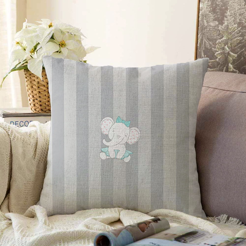 Gri Çizgili Fil Motifli Bebek Odası Raşel Kadife Yastık Kırlent Kılıfı