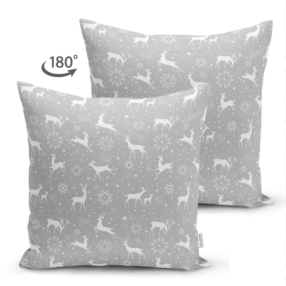 Çift Taraflı Gri Zeminli Geyikler ve Kar Taneleri Tasarımlı Dijital Baskılı Süet Kırlent Kılıfı Realhomes