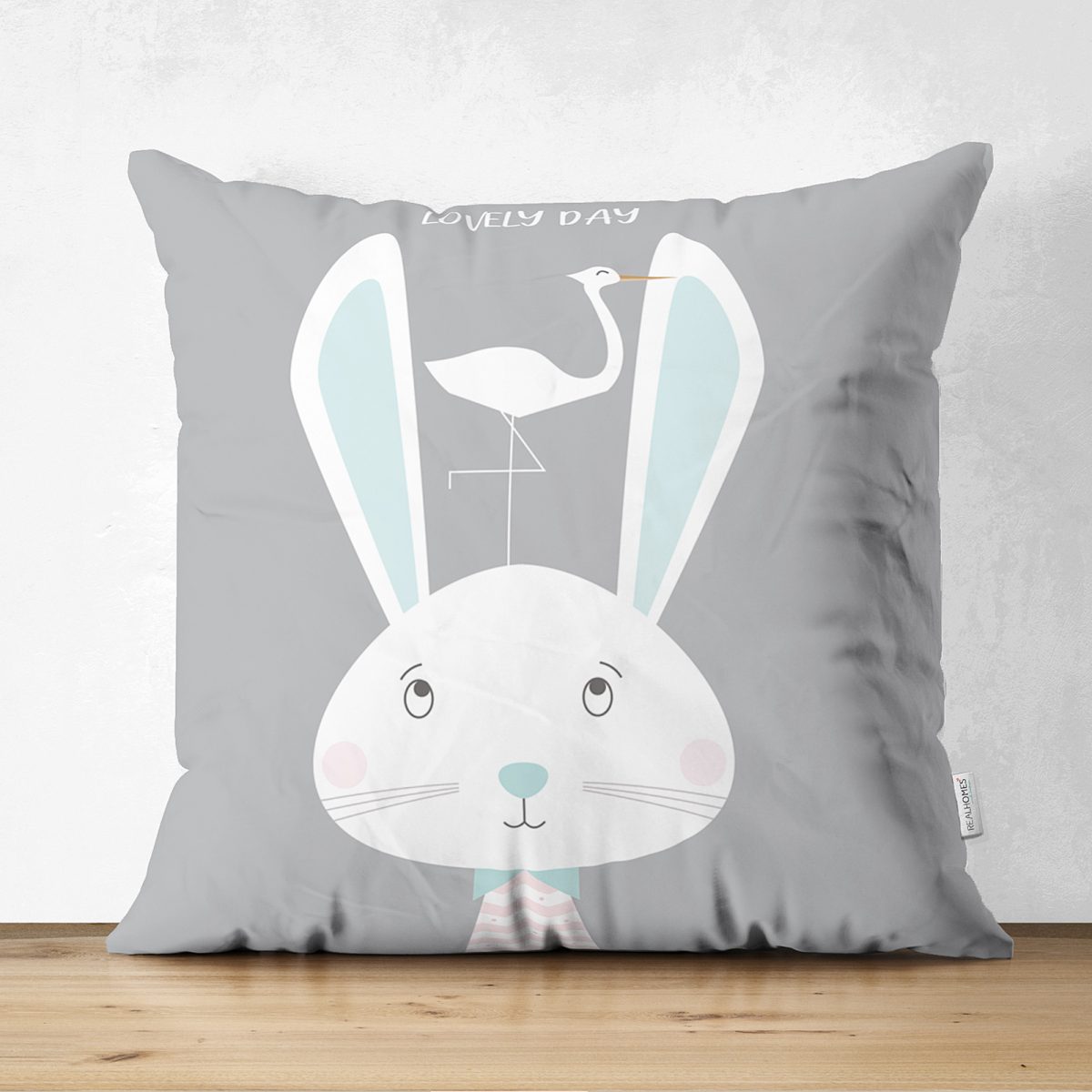 Çift Taraflı Gri Zeminli Tavşan Desenli Bebek Odası Süet Yastık Kırlent Kılıfı