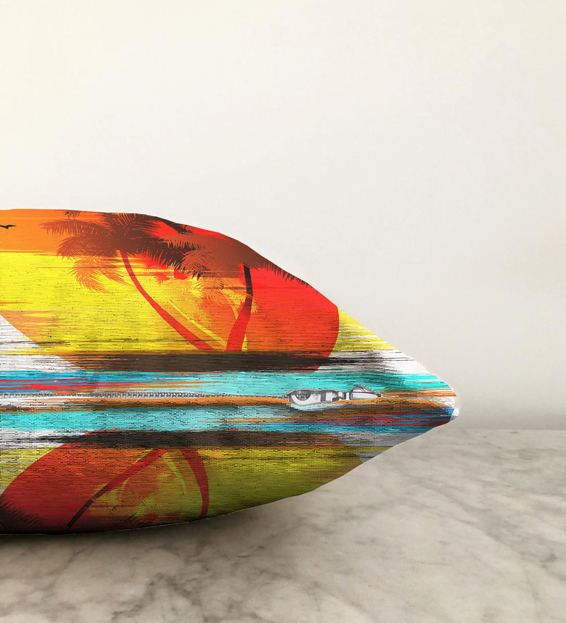Gün Batımında Palmiye Ağaç Temalı Özel Tasarım Raşel Kadife Yastık Kılıfı
