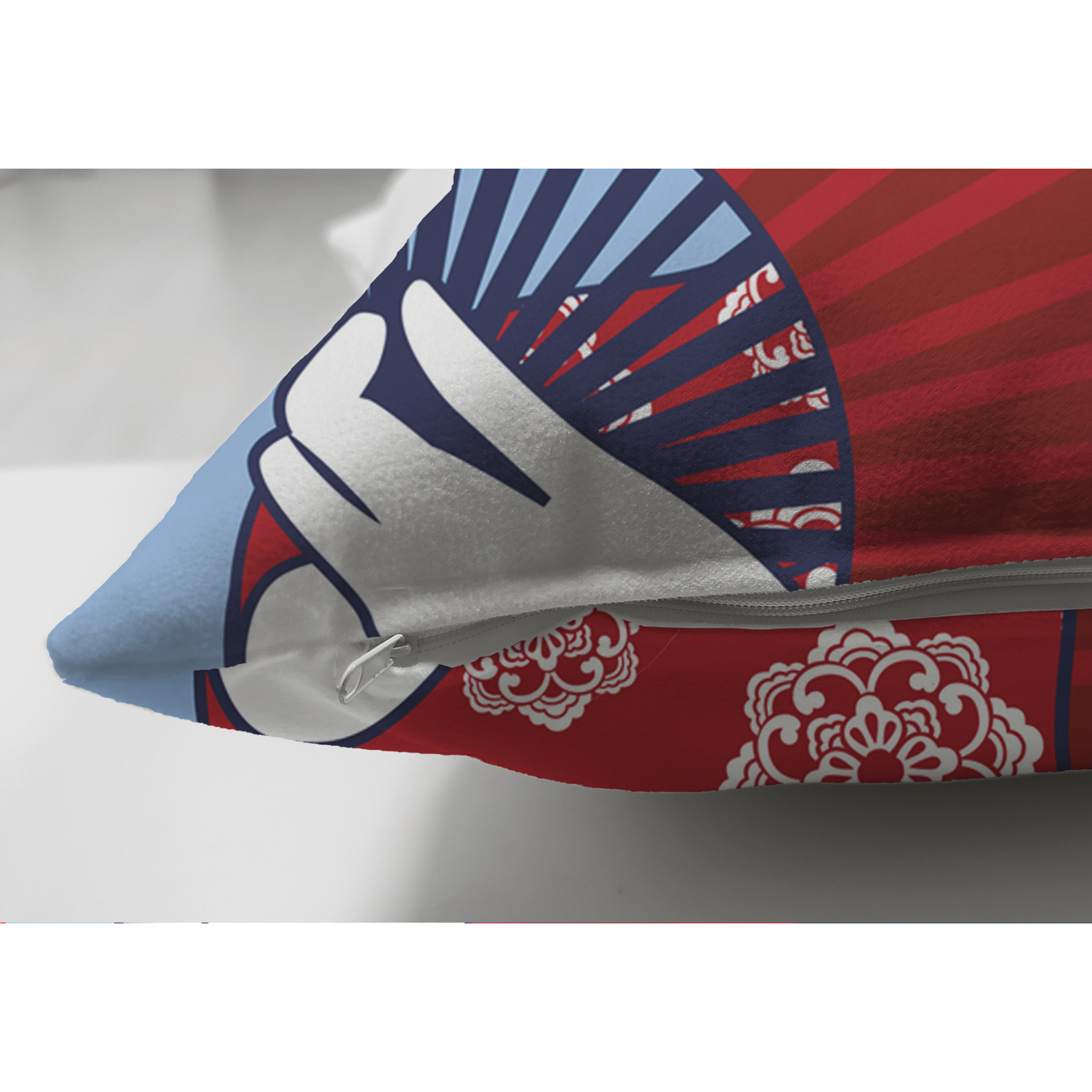 Çift Taraflı Kırmızı Yelpazeli Mavi Zeminli Japon Kadın Modern Süet Yastık Kılıfı Realhomes