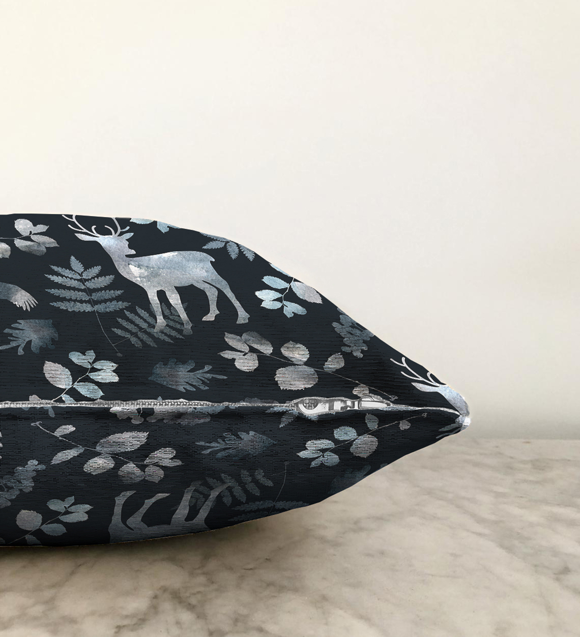 Lacivert Zeminde Geyik ve Yaprak Motifleri Dijital Baskılı Raşel Kadife Kırlent Kılıfı