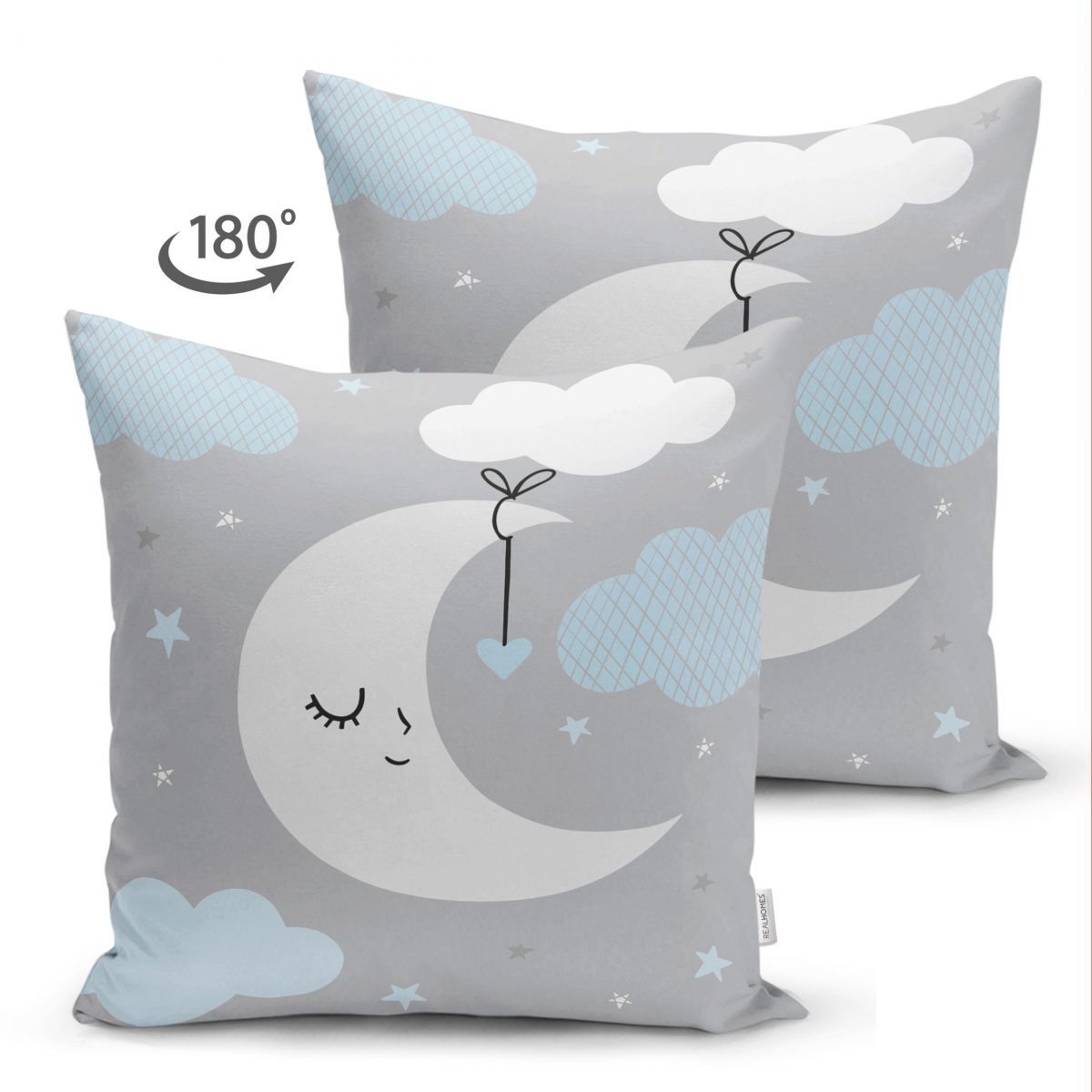 Çift Taraflı Mavi Bulut ve Gri Ay Tasarımlı Bebek Odası Süet Yastık Kırlent Kılıfı Realhomes