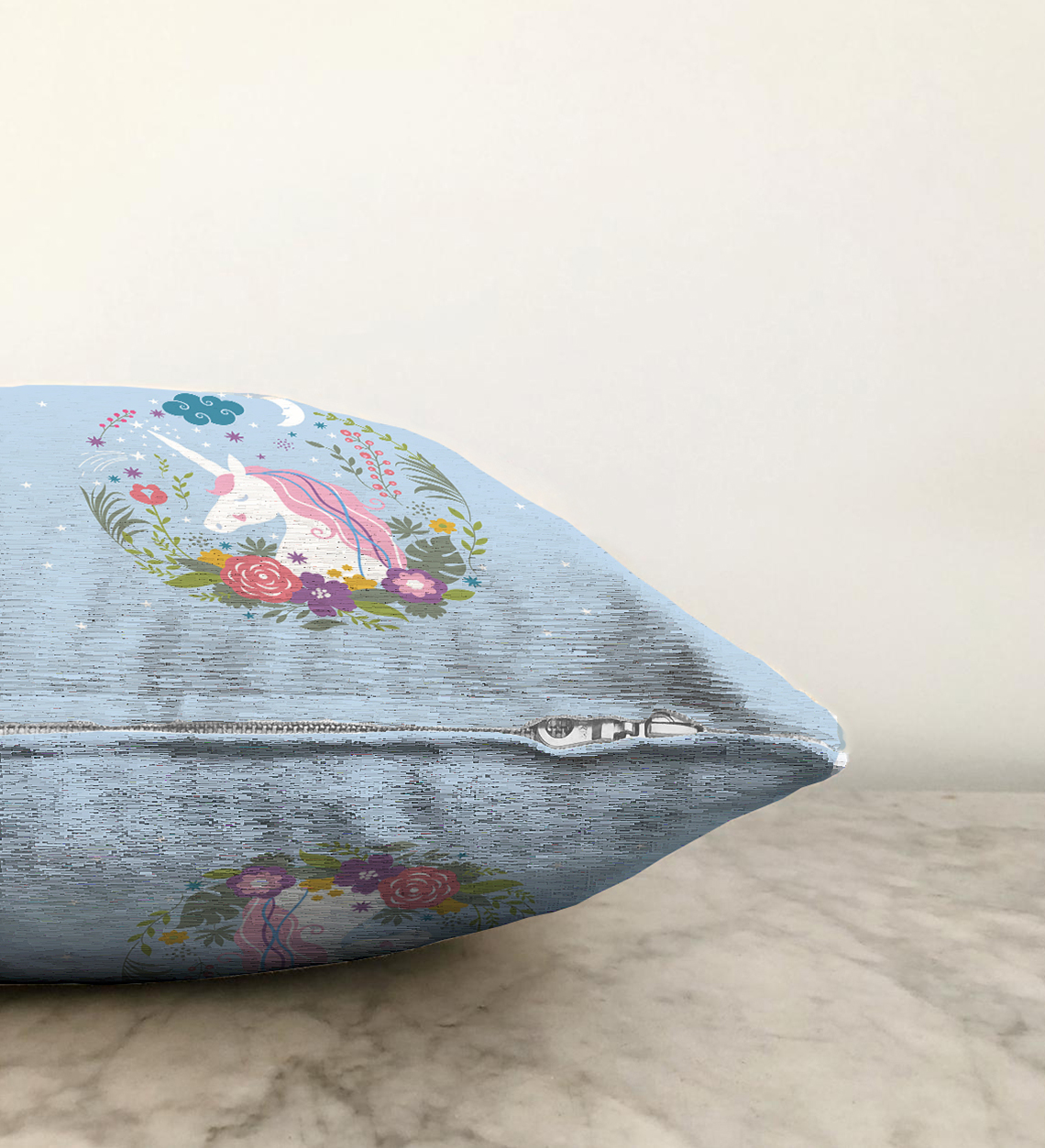 Mavi Zeminde Unicorn At Desenli Çocuk Odası Raşel Kadife Yastık Kırlent Kılıfı