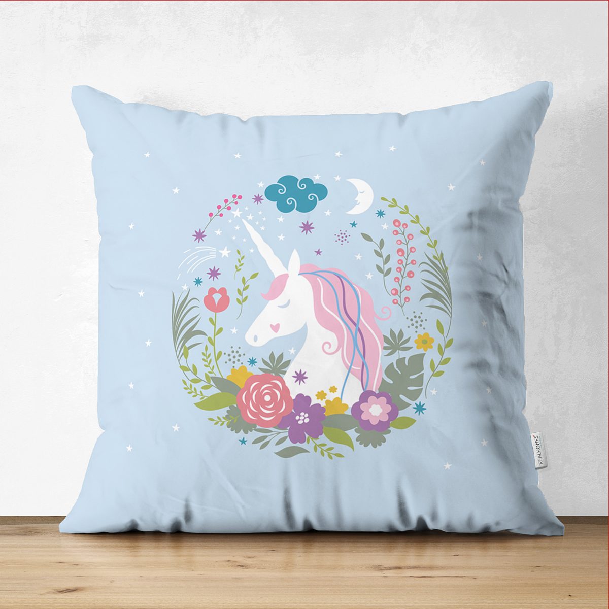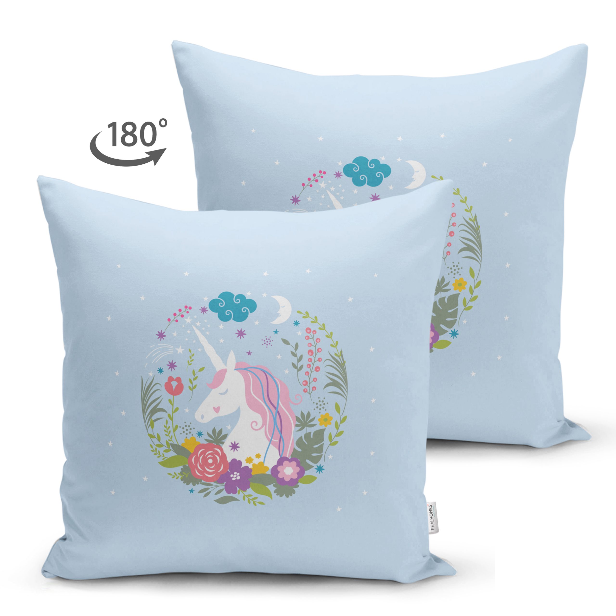 Çift Taraflı Mavi Zeminde Unicorn At Desenli Çocuk Odası Süet Yastık Kırlent Kılıfı Realhomes