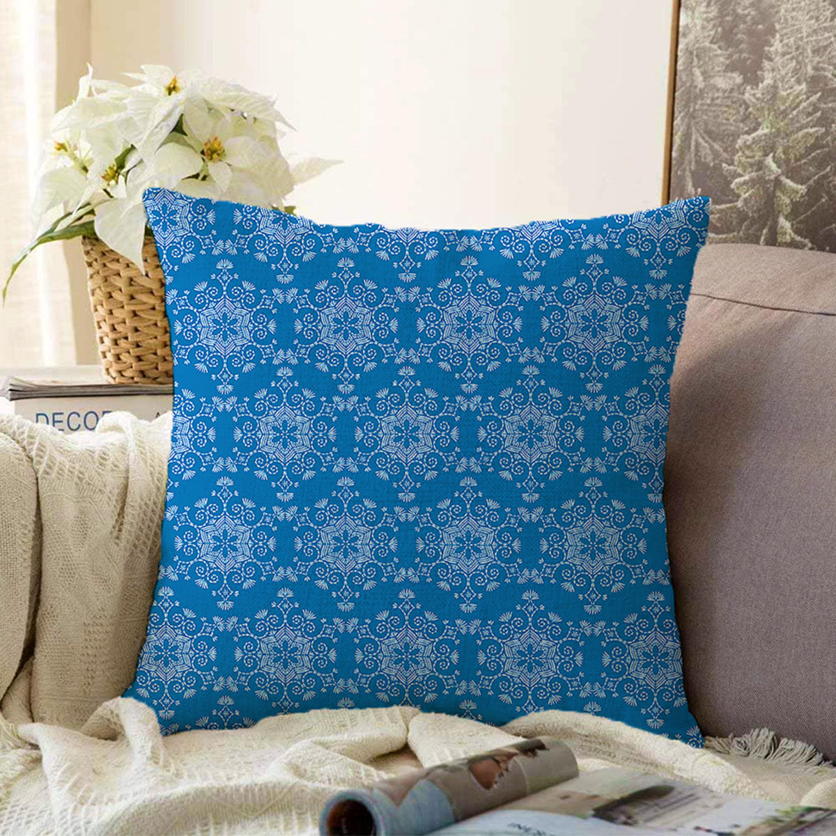 Mavi Zeminli Kartanesi Desenli Dijital Baskılı Modern Raşel Kadife Yastık Kırlent Kılıfı