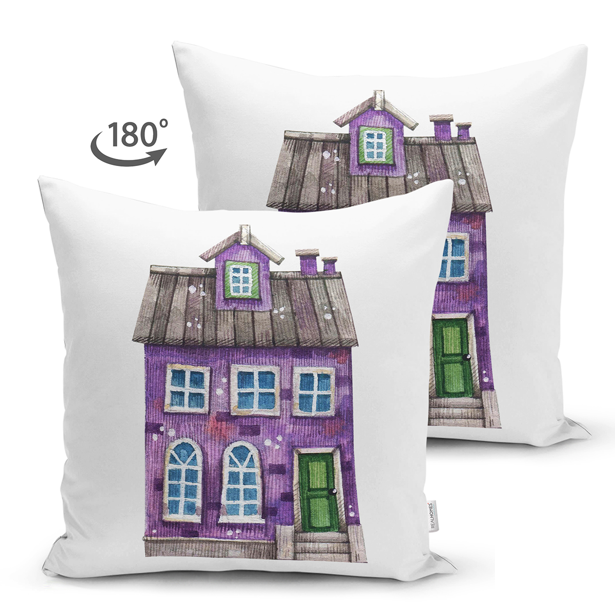 Çift Taraflı Minyatür Mor Ev Çizimli Dijital Baskılı Modern Süet Yastık Kırlent Kılıfı