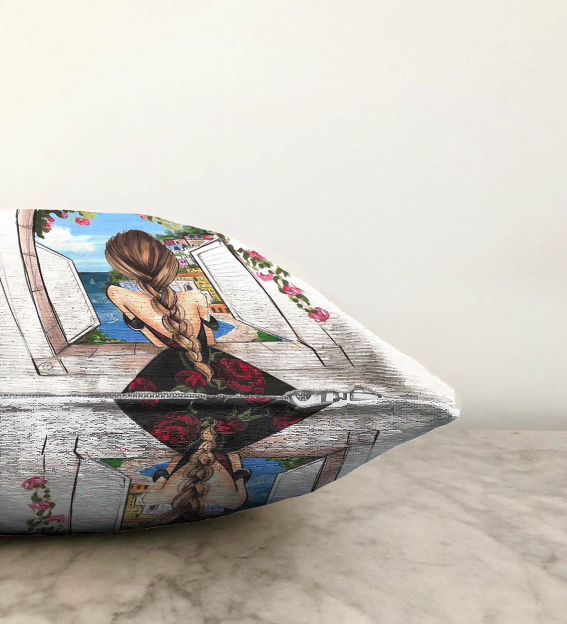 Mutluluk Manzarası Suluboya Çizimli Özel Tasarım Dekoratif Raşel Kadife Yastık Kırlent Kılıfı