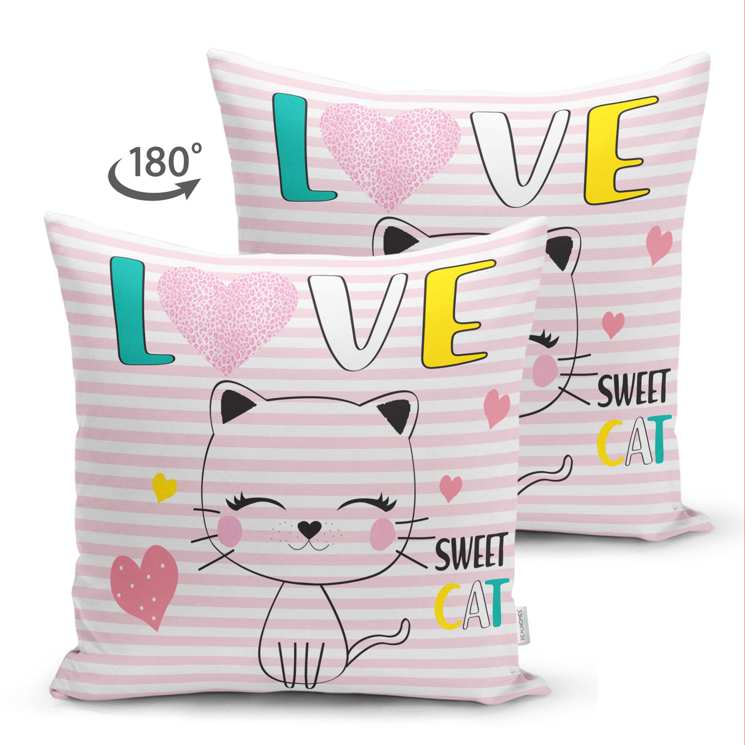 Çift Taraflı Pembe Çizgili Zeminde Sweet Cat Tasarımlı Süet Yastık Kılıfı