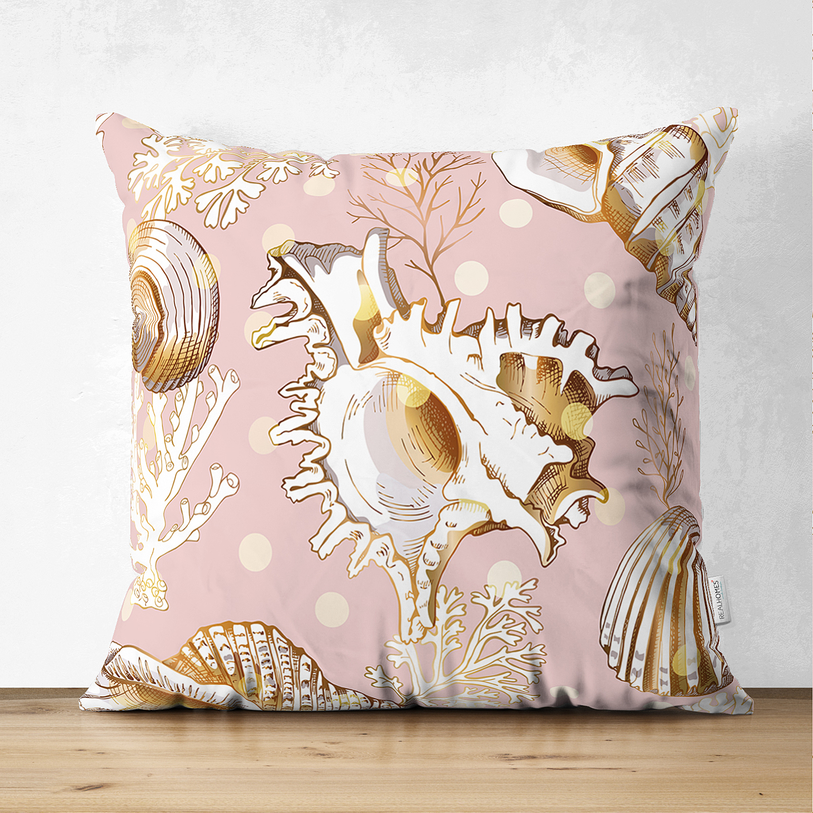 Çift Taraflı Pembe Zeminde Deniz Kabukları Modern Süet Yastık Kırlent Kılıfı Realhomes