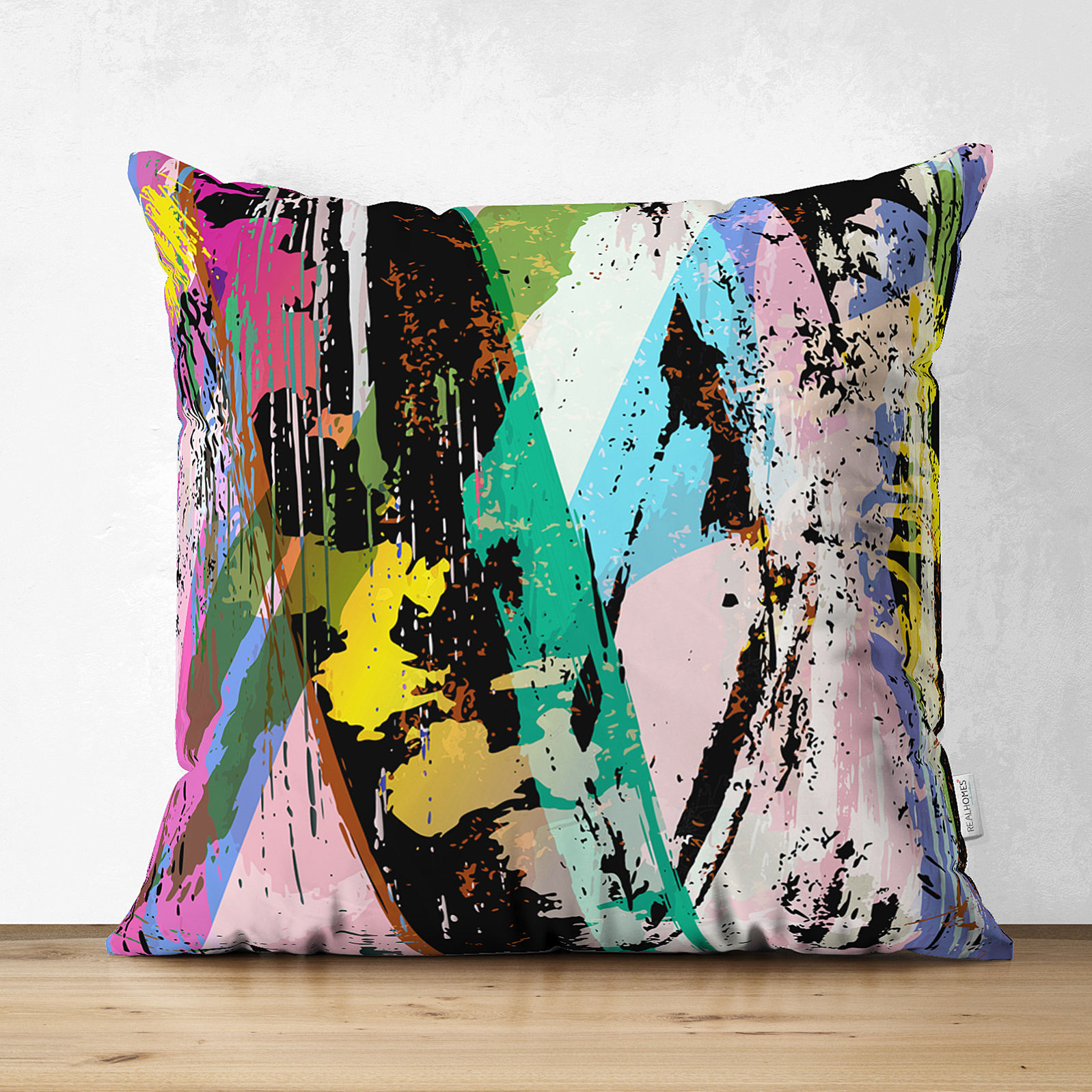 Çift Taraflı Renkli Sulu Boya Fırça Darbeli Motifli Modern Süet Yastık Kılıfı