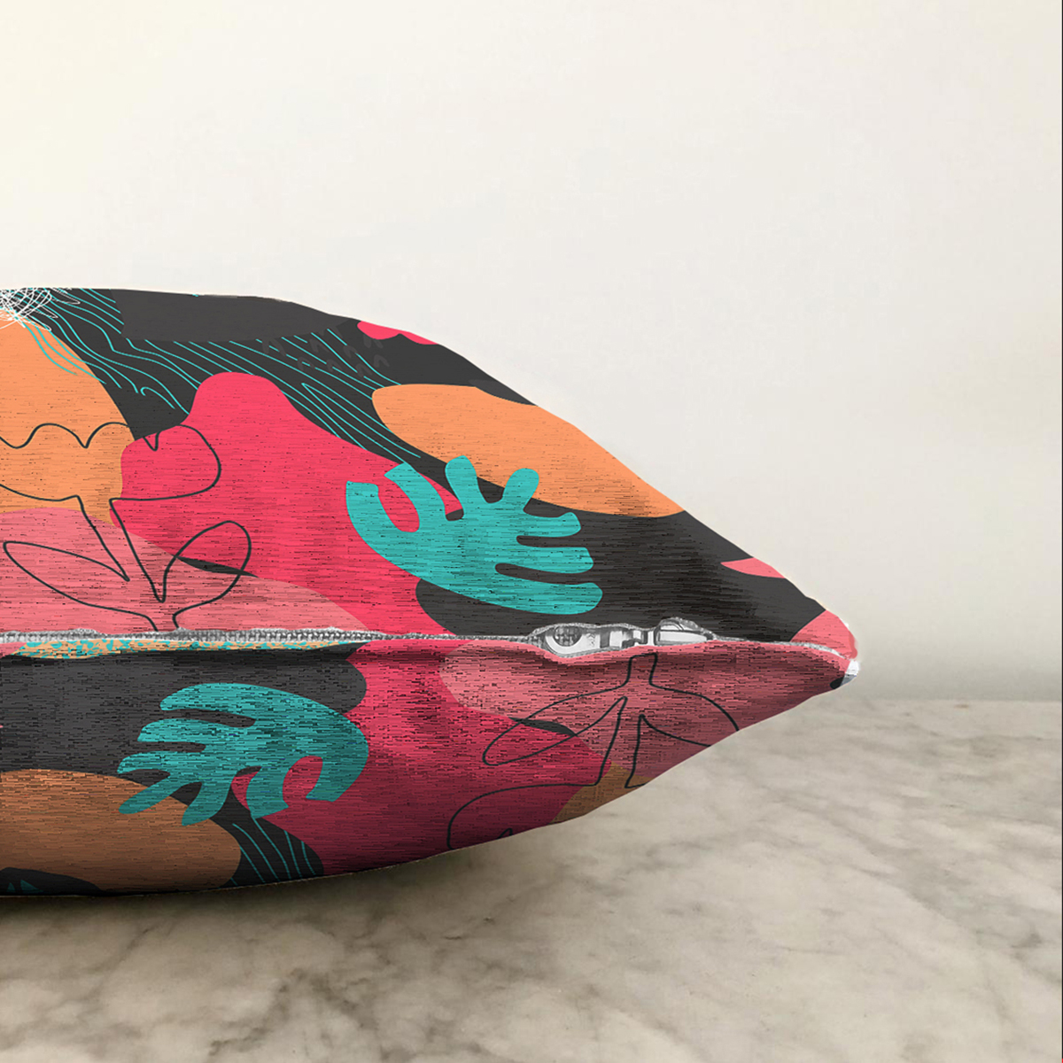 Renkli Zemin Üzerinde Geometrik Yaprak Desenli Modern Raşel Kadife Yastık Kırlent Kılıfı