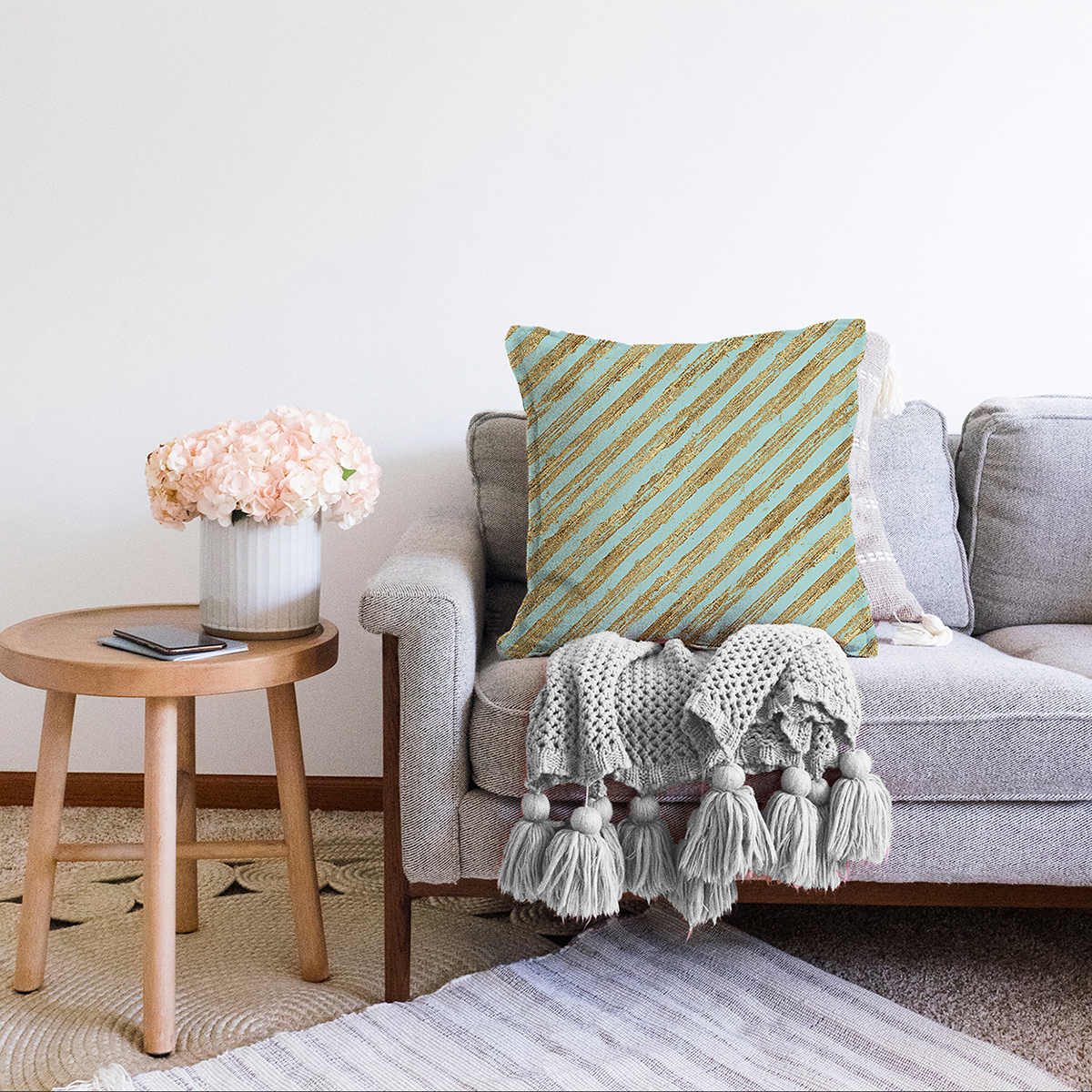 Renkli Zemin Üzerinde Gold Detaylı Yatay Çizgili Modern Raşel Kadife Yastık Kırlent Kılıfı