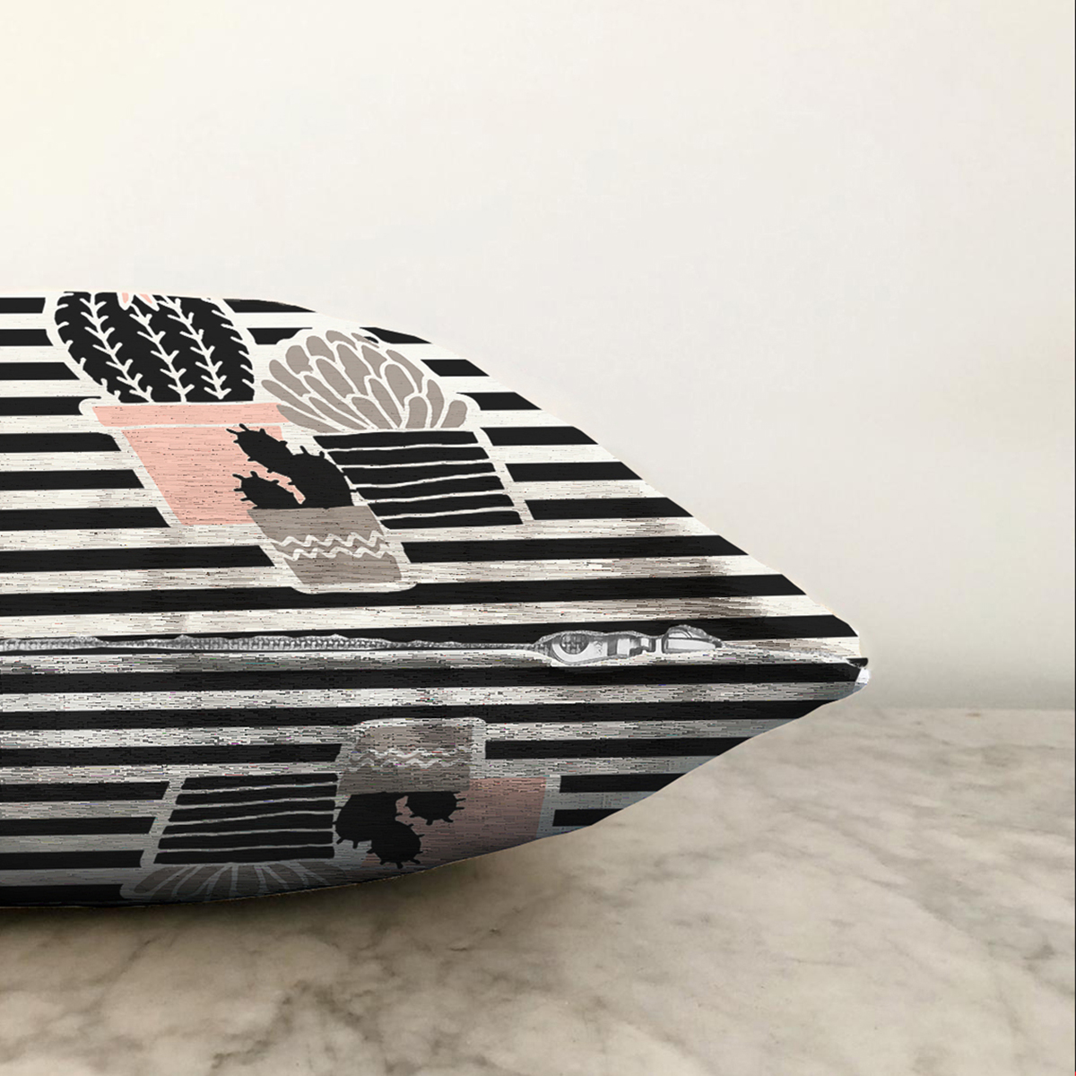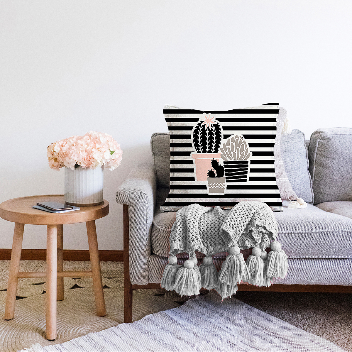 Renkli Zemin Üzerinde Siyah Çizgili Kaktüs Desenli Modern Raşel Kadife Yastık Kırlent Kılıfı