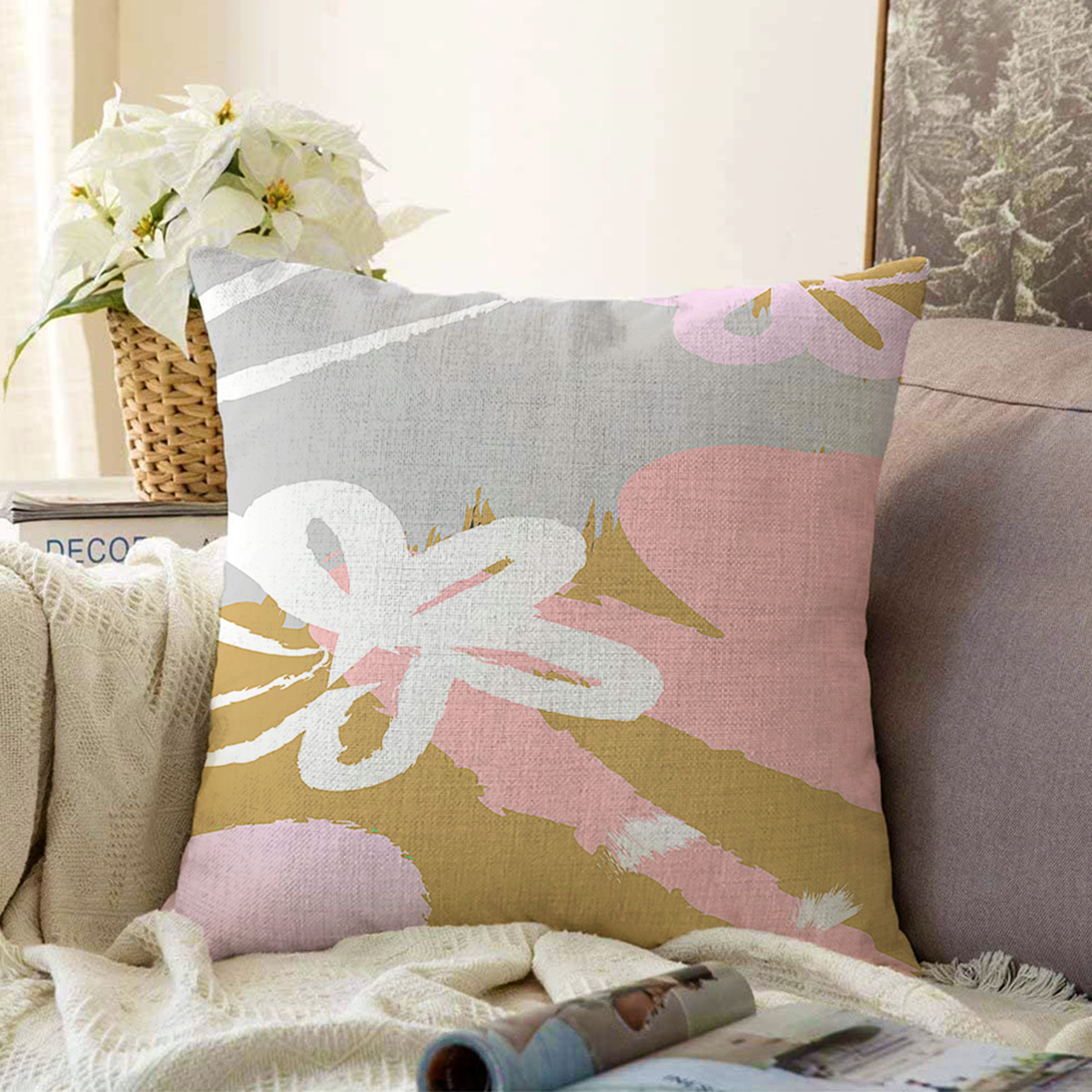 Rengarenk Zemin Üzerinde Soyut Çizimli Çiçek Desenli Modern Raşel Kadife Yastık Kırlent Kılıfı